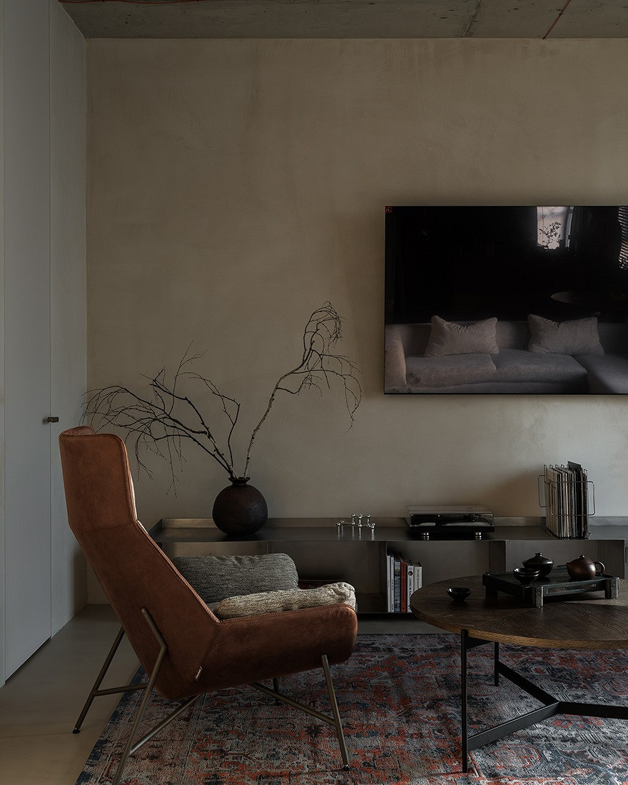 Цветовая гамма чаще всего теплая нейтральная: подойдут графитовый и другие оттенки серого, терракота, бежевый, цвет дерева. Чтобы интерьер не казался перегруженным и слишком темным, добавьте светлые акценты: например, фактурные подушки, комнатные растений или ковер из джута.