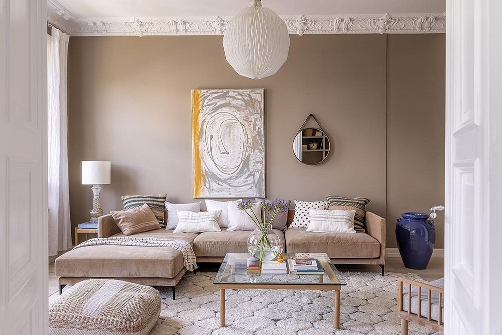 Яркие цвета в большом количестве не используются, но с их помощью можно расставить акценты, на которых будет останавливаться взгляд. Чтобы разбавить нейтральность обстановки, применяют смешанные приглушенные колеры: хаки, грязно-розовый, полынный, кукурузный, песочный. В таких расцветках могут быть подушки, несколько стульев, небольшой ковер или светильник. Также в сканди используют черный и темно-коричневый, однако они тоже должны дополнять основную палитру, а не доминировать в ней.