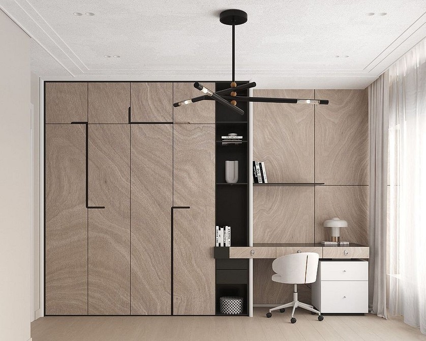 Шкафы делают скрытыми и очень вместительными. Внутри должно быть много разных отделений, где можно хранить любую одежду, соблюдая идеальный порядок. Хорошо вписывается в такой интерьер шкаф-купе.
