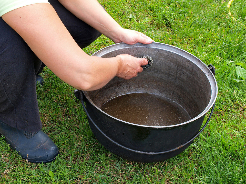 Котел тщательно отмывают от остатков еды, он должен быть чистым. После этого помещают его в духовой шкаф или ставят на плиту. Разогревают до максимально возможной температуры и греют полтора-два часа. Потом остужают, щеткой оттирают остатки нагара. Если есть такая возможность, котел можно поставить на открытый огонь, например, в костер. Держать посуду в огне нужно достаточно долго, чтобы смесь жира и сажи сгорела и начала отваливаться.