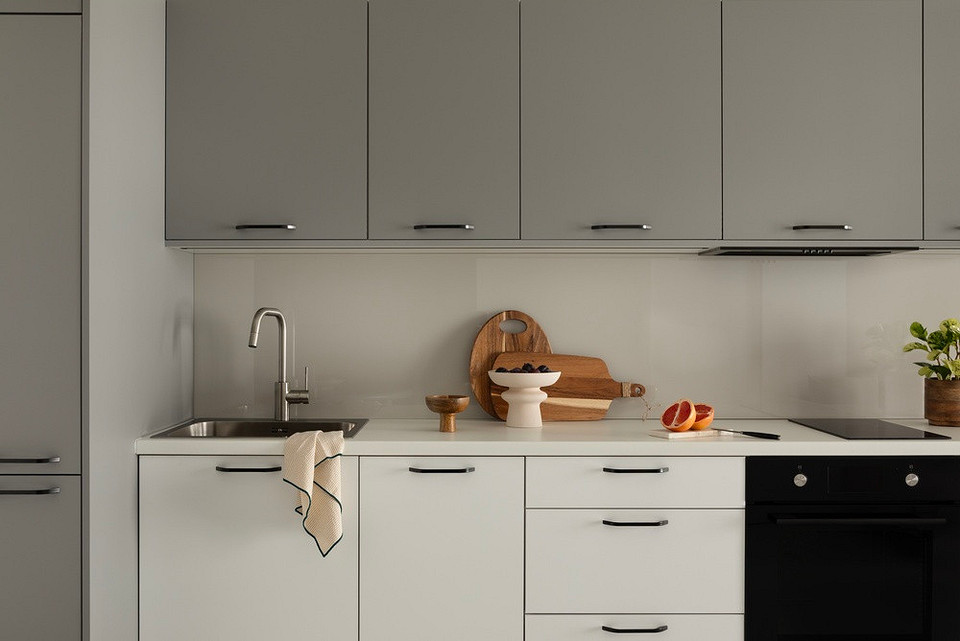 Продуманная система хранения избавляет не только от визуального шума. Добавьте разделители в ящики, поставьте эстетичные закрытые органайзеры на столешницы — мелкие предметы не будут пылиться и мешать во время уборки. Кроме того, так проще находить нужное и избегать хаоса в быту.
