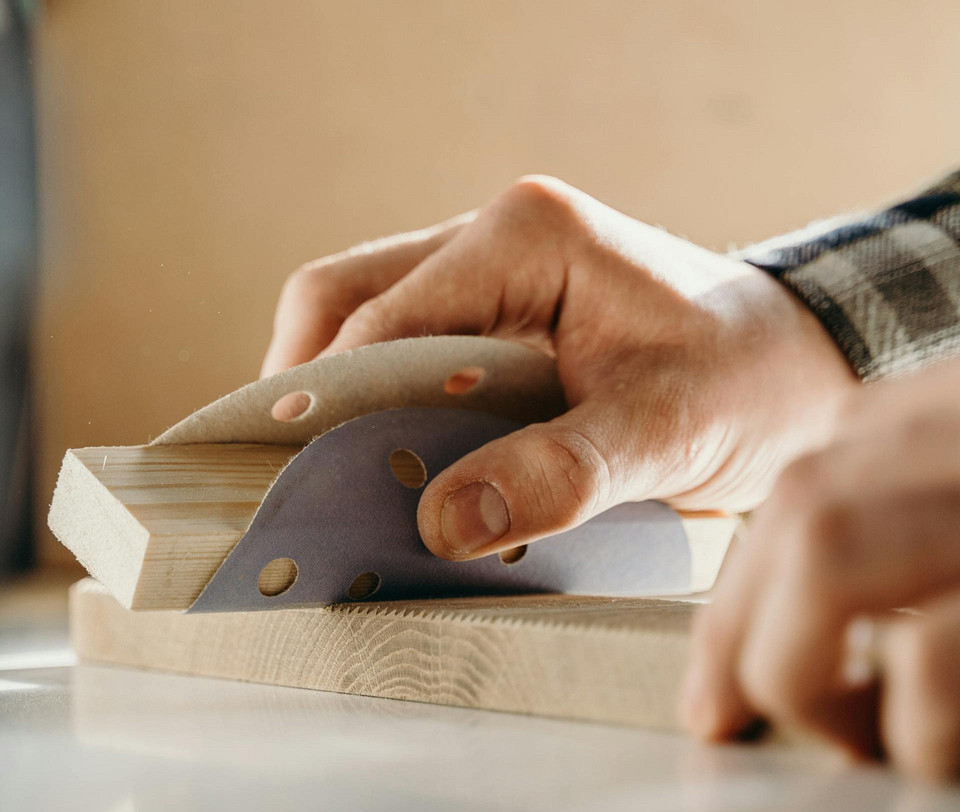 - Если на дереве заметны царапины, неровности и сколы, его надо отшлифовать. Для этого можно использовать как специальные инструменты (например, шлифовальную машину), так и брусок, обернутый наждачную бумагу (с показателем зернистости 150-240 для устранения заметных повреждений и 240 — для идеально гладкой полировки). Наждачкой обрабатывают только сухую поверхность (вдоль волокон) и начинают с самого грубого абразива (чем тверже древесина, тем более крупную зернистость можно выбирать), постепенно меняя его на более тонкий.