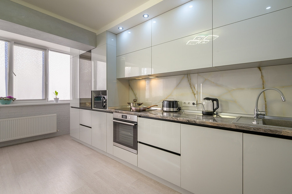 Глянец легко узнаваем по характерному блеску. Гладкая блестящая поверхность может быть окрашена в самые разные цвета. Она очень красива, но капризна в уходе. На глянце очень заметны жирные или грязные пятна, становятся видны даже следы от пальцев, если кто-то дотронулся до блестящей поверхности. Уход за глянцем зависит от его типа. Для производства мебели чаще всего используют глянцевые фасады с разным типом покрытия. Кратко охарактеризуем самые распространенные.