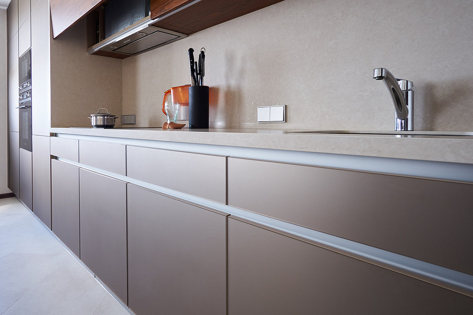Матовые фасады не блестят, могут иметь различную текстуру, поверхность выглядит бархатистой. Загрязнения на таком покрытии менее заметны, но это не означает, что ему не нужен уход. Поверхность не такая гладкая, как у глянца, поэтому частички жира, пыль и другая грязь проникают в поры, со временем буквально въедаются в поверхность. Как и глянец, матовый материал имеет несколько видов покрытия. Кратко их охарактеризуем.