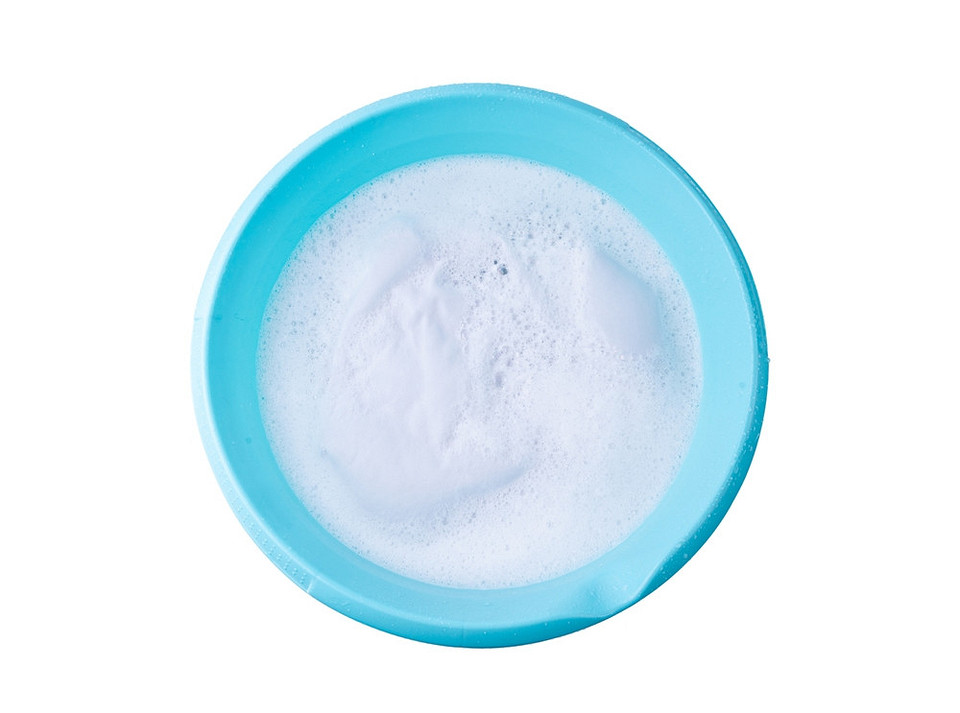 - Наберите в него теплую воду, температура не выше 35-40°C. Отмерьте моющее средство, размешайте его до полного растворения.