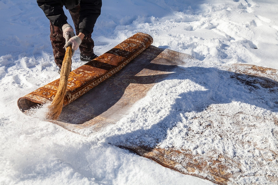 Зимой можно провести чистку коврового покрытия снегом. Это возвращает ему яркость красок, удаляет запахи, придает приятный аромат свежести и избавляет от пылевого клеща. Перед очисткой нужно внимательно осмотреть ковер. Если на нем есть въевшиеся пятна, их обрабатывают подходящим пятновыводителем, потом очищают. Изделие нельзя чистить снегом сразу же после химической обработки, можно повредить ворсинки. К чистке приступают через сутки-двое после химической обработки.