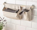 Вообще, этот модуль предназначен для кухни. Но кто сказал, что его нельзя повесить в ванной? Например, чтобы разгрузить столешницу у раковины и избавиться от цветных стаканчиков для разных мелочей. Неокрашенная ткань с грубой текстурой из пеньки и хлопка отлично впишется в скандинавский или экоинтерьер.