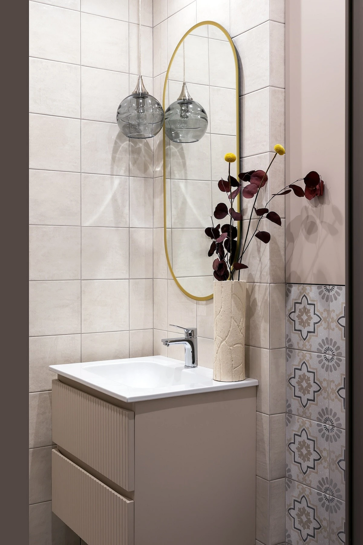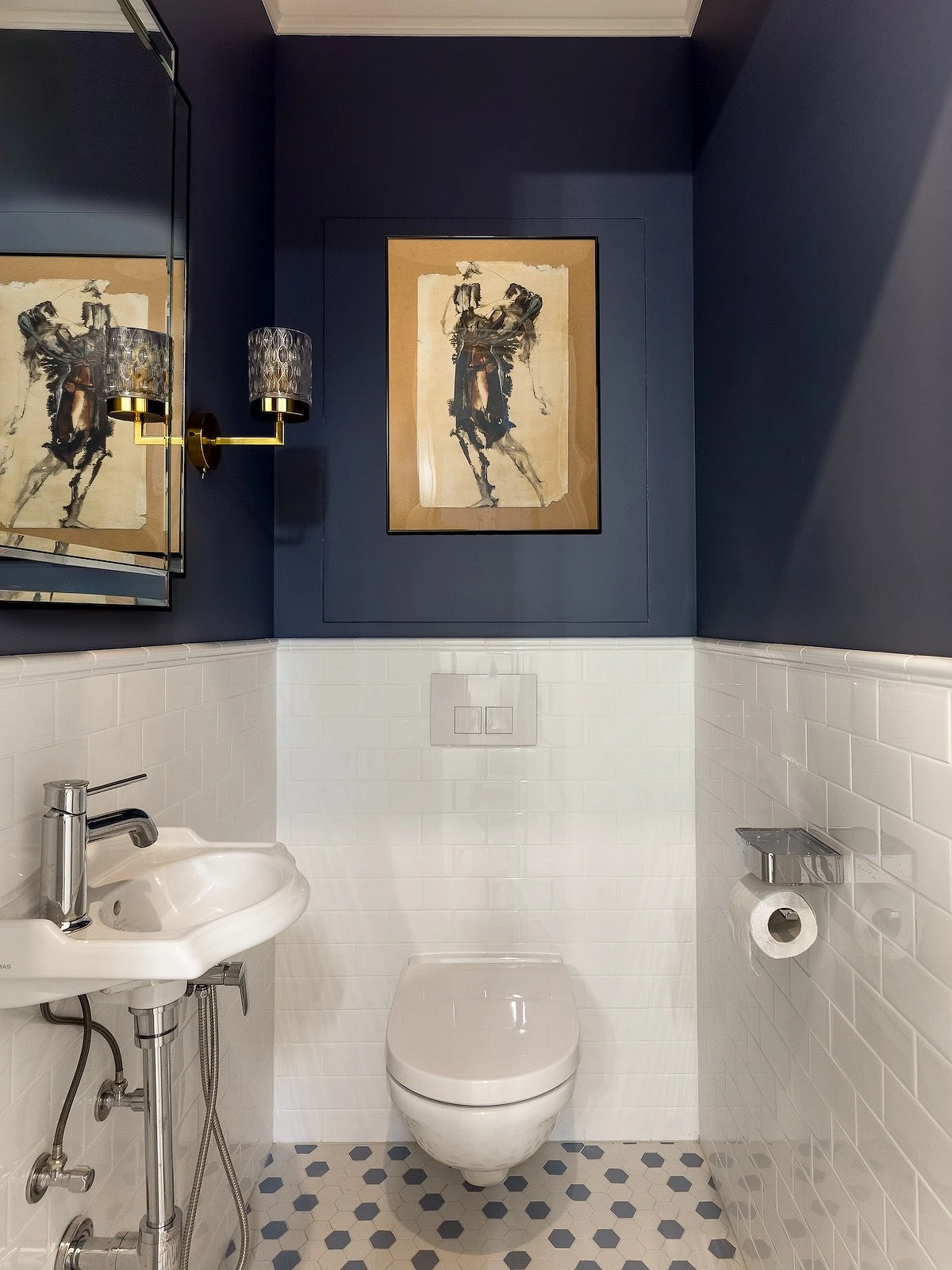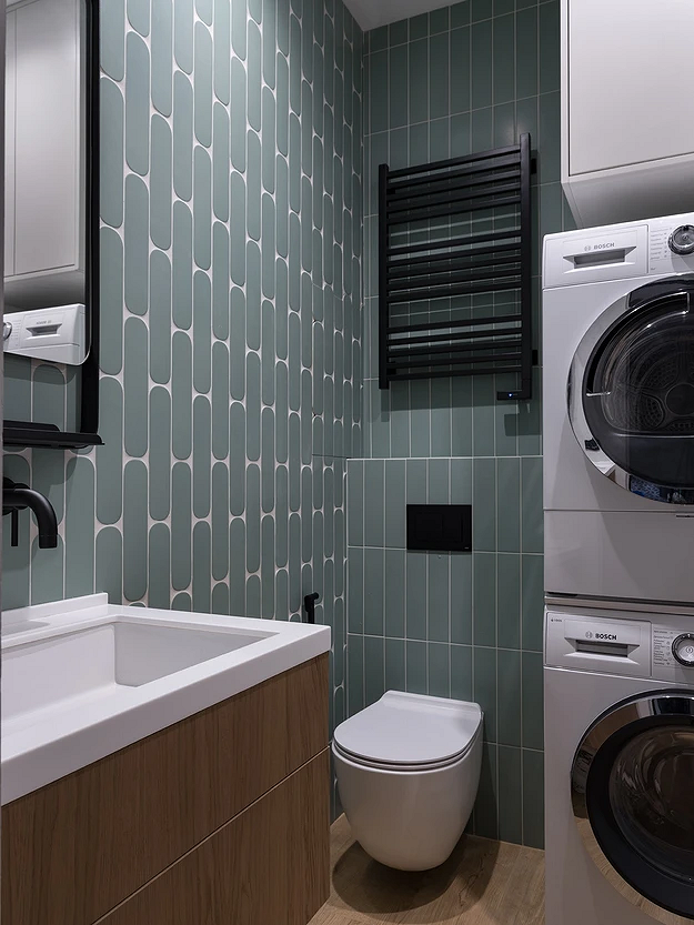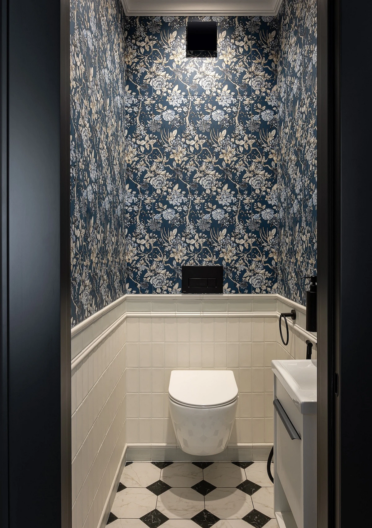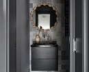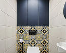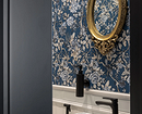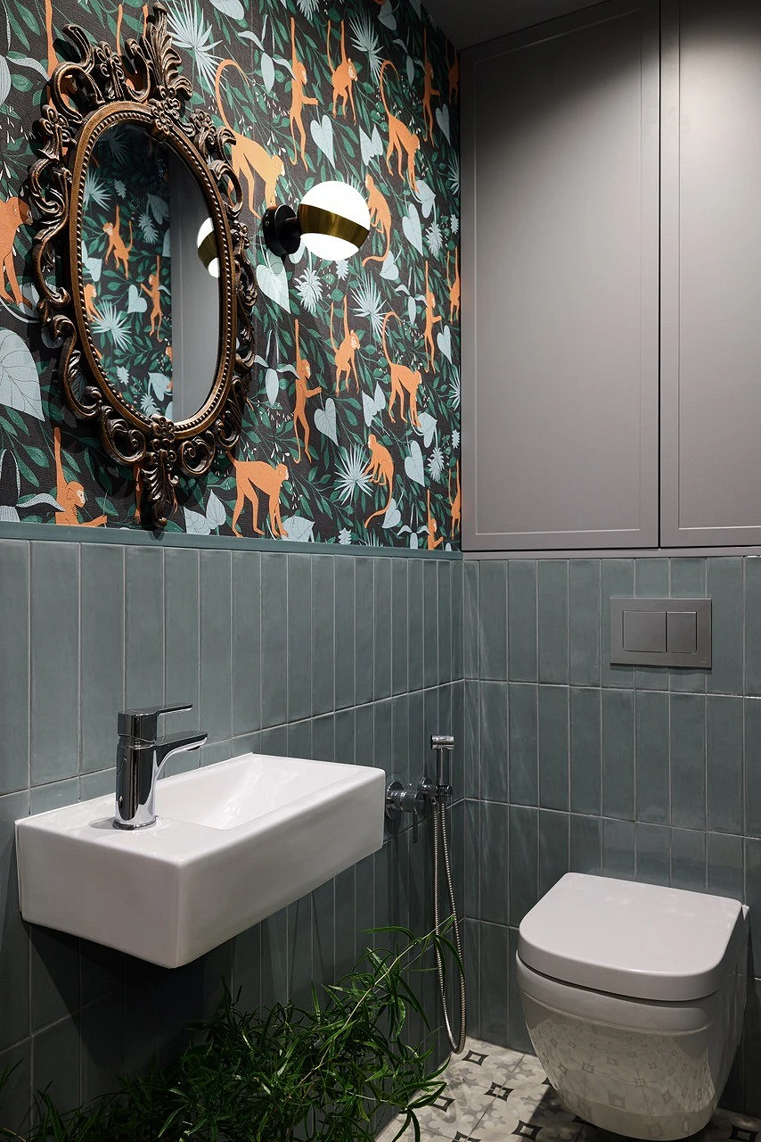 Если вы любите нетривиальные дизайнерские решения, этот санузел вам точно понравится. Квартира предназначена для краткосрочной аренды, поэтому дизайнер сделала ставку на яркие визуальные эффекты. В оформлении туалета использовали сразу несколько смелых приемов: темная палитра, обои с цветочным рисунком, зеркало в фигурной винтажной раме. А благодаря светлой плитке и сантехнике помещение не выглядит тесным.