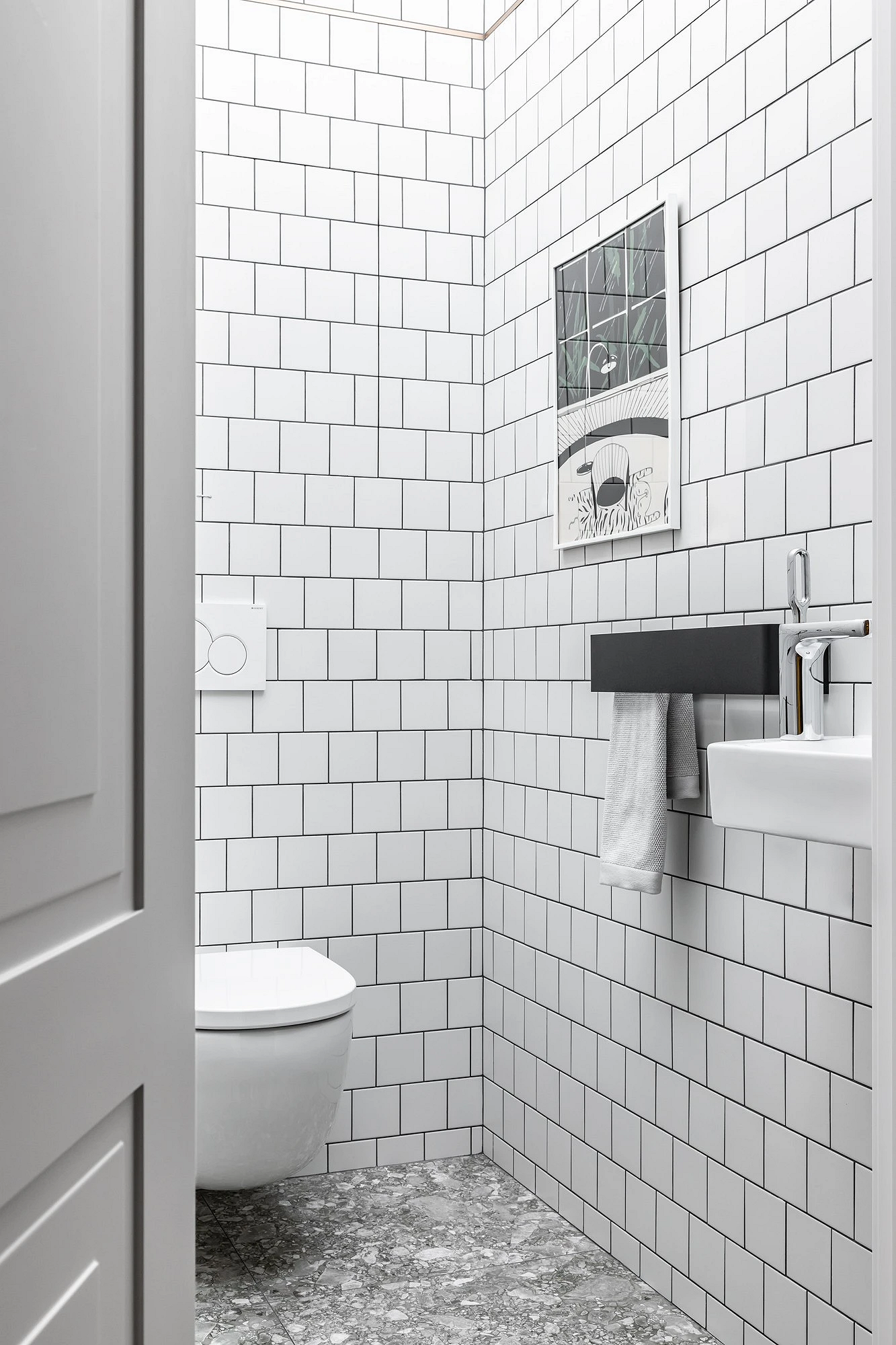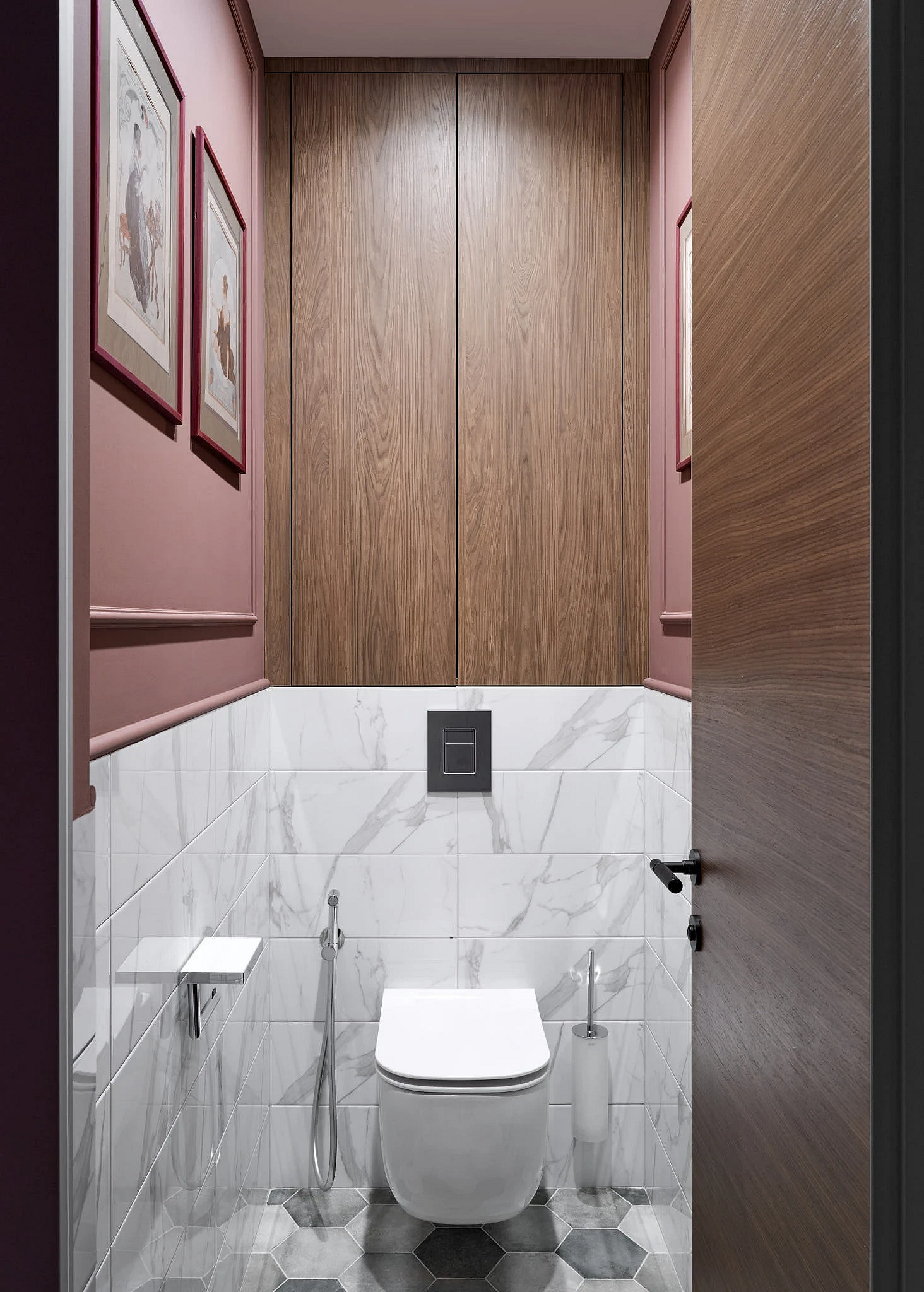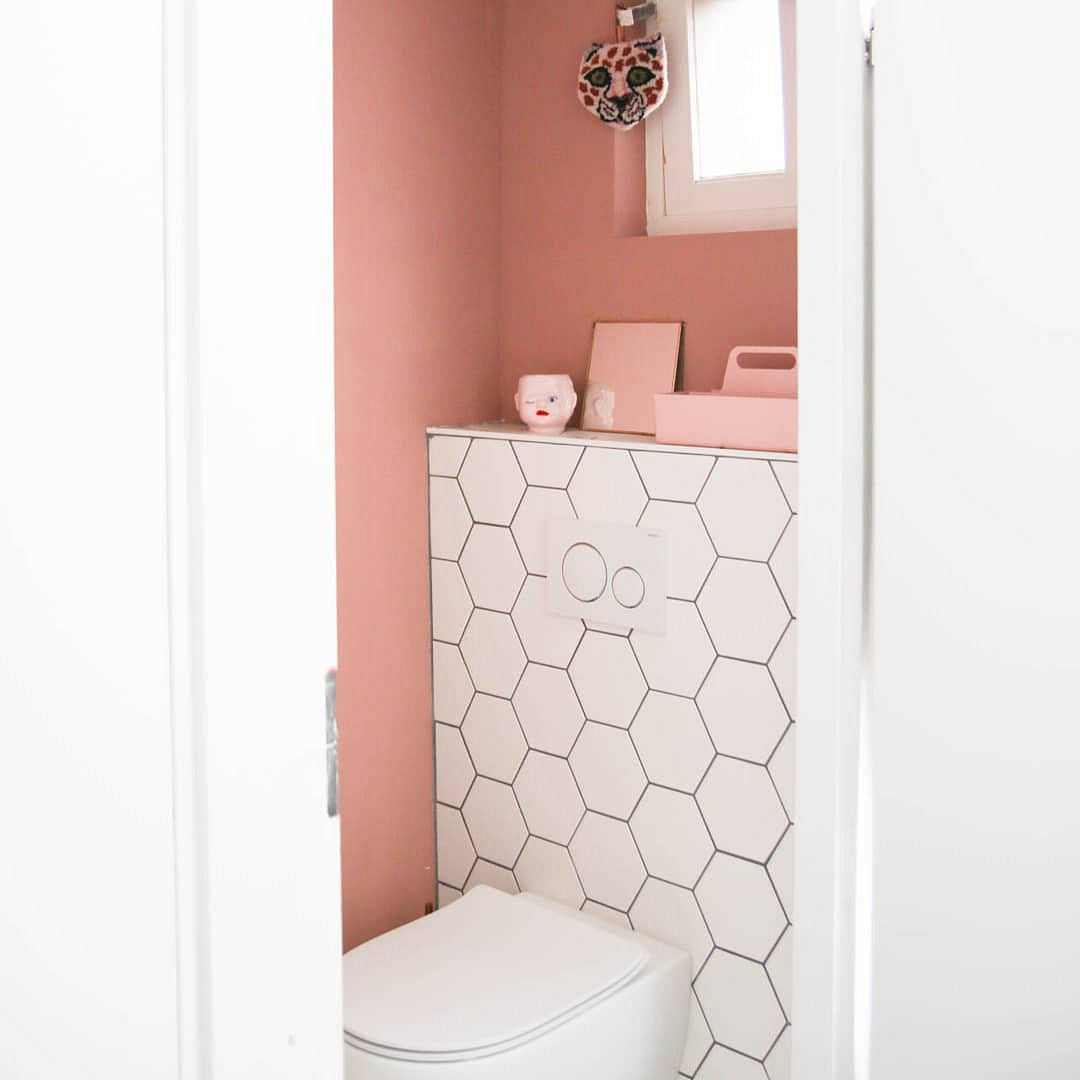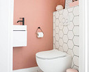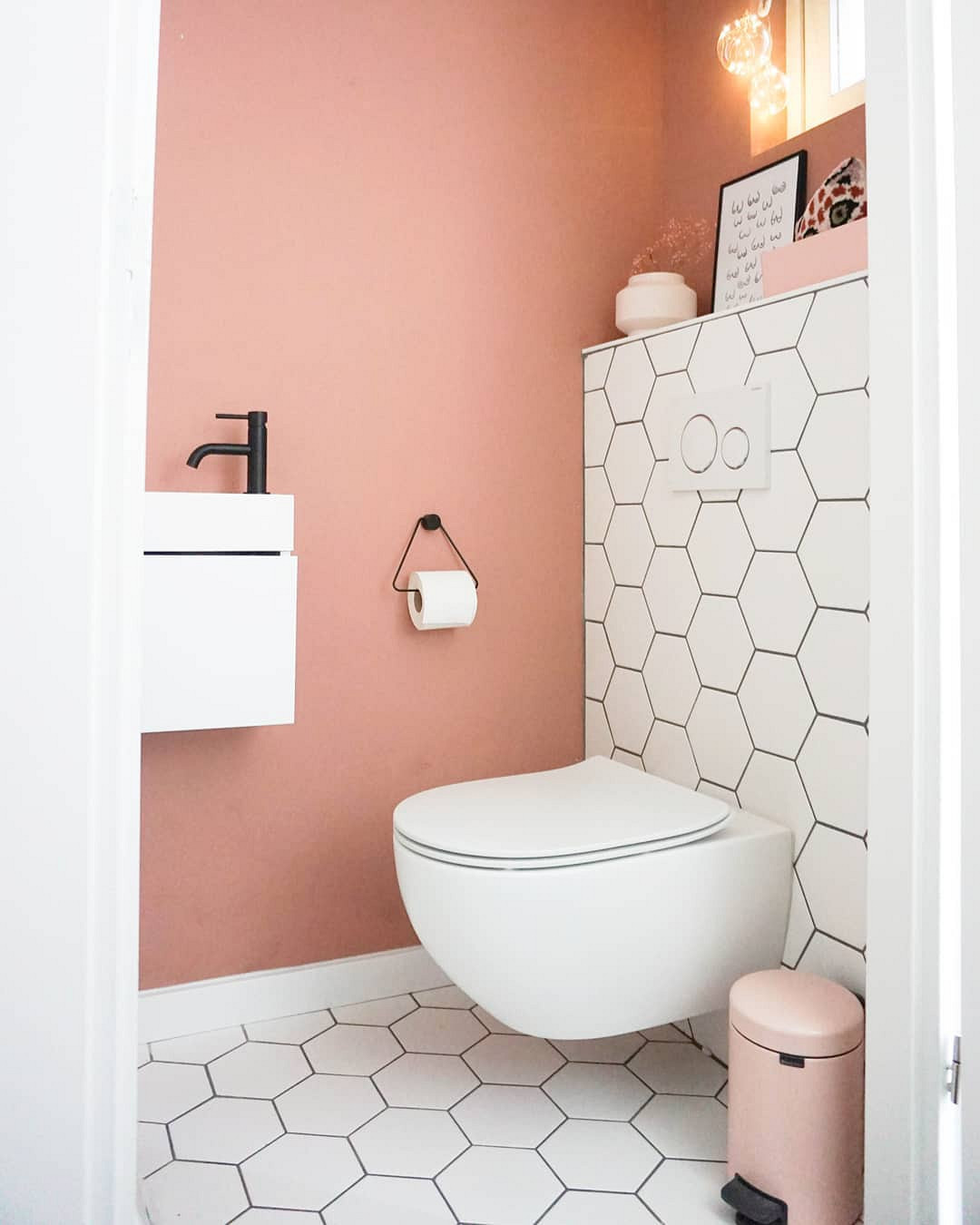 Совсем другое настроение царит в этом помещении. Санузел оформлен в лучших традициях скандинавского стиля: простые формы, никакой мебели, неброский декор. Основной акцент сделан на шестиугольную плитку и сложный розовый оттенок стен. Отделка привлекает к себе достаточно внимания, и ее лишь подчеркнули парой украшений. Черно-белая сантехника оттеняет керамику и добавляет дизайну графичности.