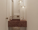 Современный дизайн маленького туалета часто предполагает минимализм, и на фото ниже — отличный пример, как можно сделать его нескучным. Интерьер получился монохромным, в светлых тонах. Но есть несколько контрастных деталей: фурнитура и, конечно, раковина. Она стала главным акцентом за счет необычного глубокого оттенка и фактуры камня. На такой маленькой площади этого вполне достаточно, чтобы получить стильный дизайн, но не перегрузить его визуально.