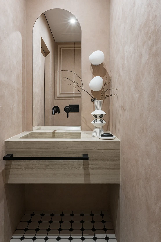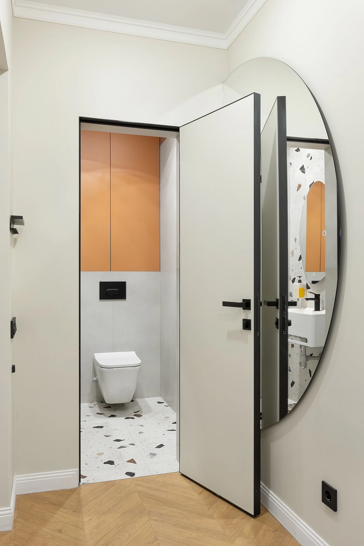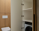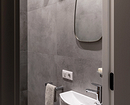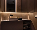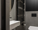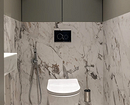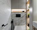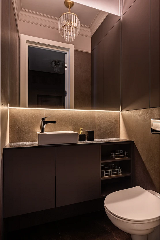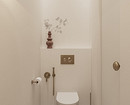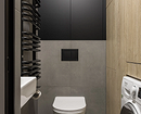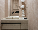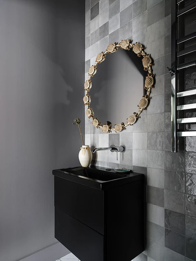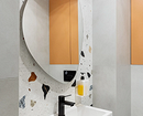 Эта двухуровневая квартира принадлежит семейной паре с сыном-студентом. В основу концепции легли природные мотивы и атмосфера загородного дома. Санузлы выполнили в более темных тонах, в том числе туалет на втором этаже оформили в черно-серой палитре. При этом он не похож на кладовку, в которой забыли включить свет, за счет продуманного освещения. А необычным акцентом стало с зеркало с рамой в виде черепашек.