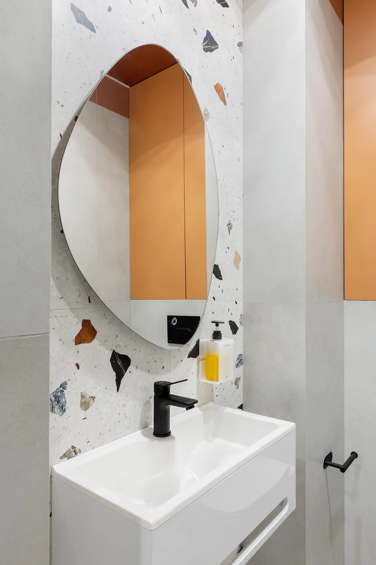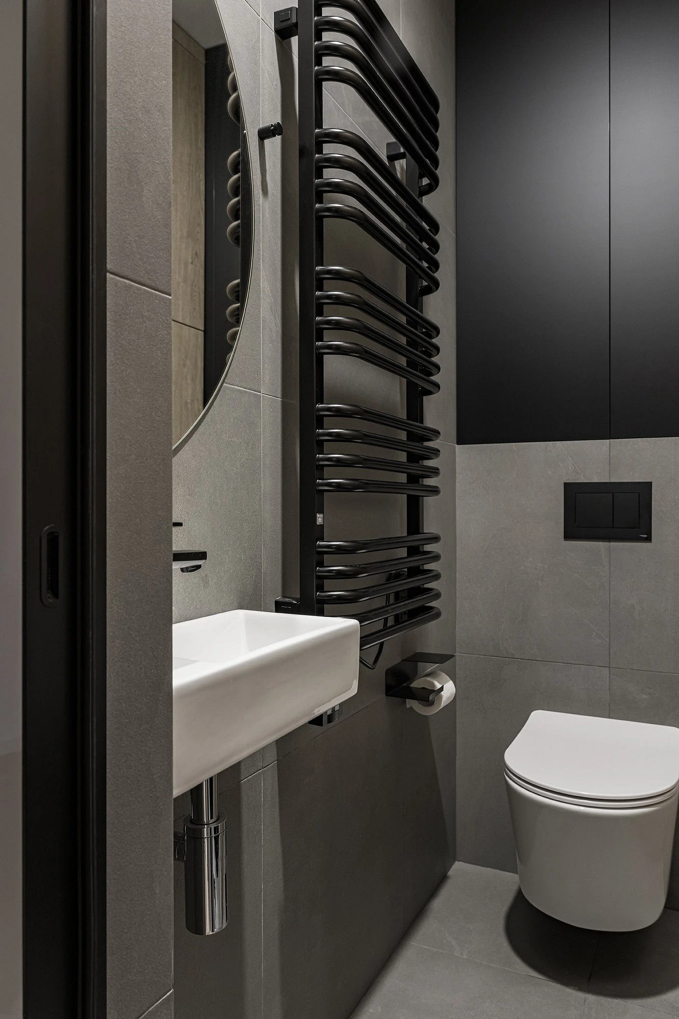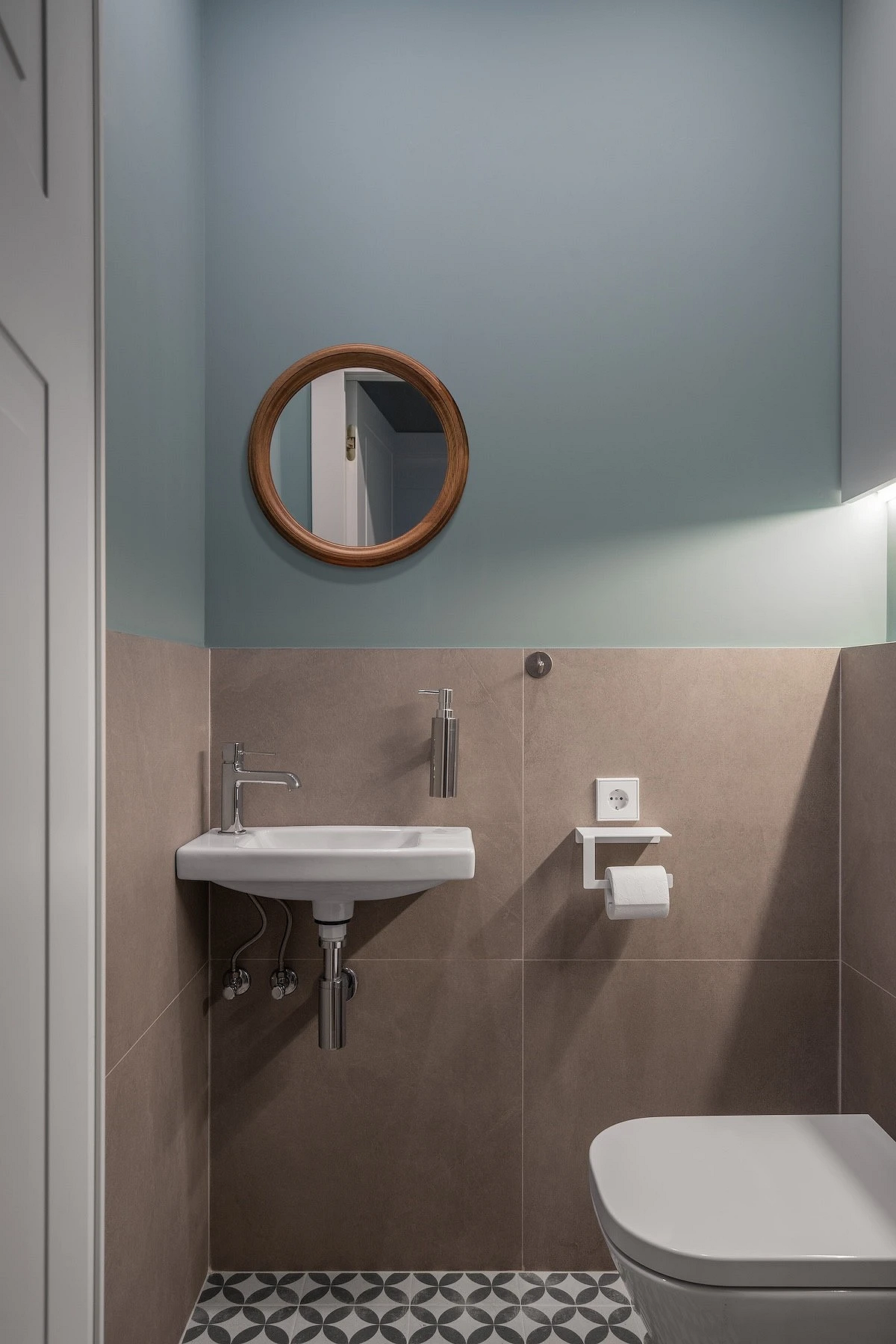 Эта двухуровневая квартира принадлежит семейной паре с сыном-студентом. В основу концепции легли природные мотивы и атмосфера загородного дома. Санузлы выполнили в более темных тонах, в том числе туалет на втором этаже оформили в черно-серой палитре. При этом он не похож на кладовку, в которой забыли включить свет, за счет продуманного освещения. А необычным акцентом стало с зеркало с рамой в виде черепашек.