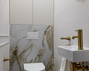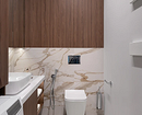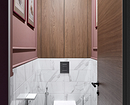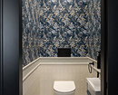 В отличие от ванной комнаты, дизайн туалета в квартире, как на фото ниже, дает больше свободы для оформления стен. Здесь нет постоянной влажности, пара и перепадов температур, поэтому подойдет любая отделка: