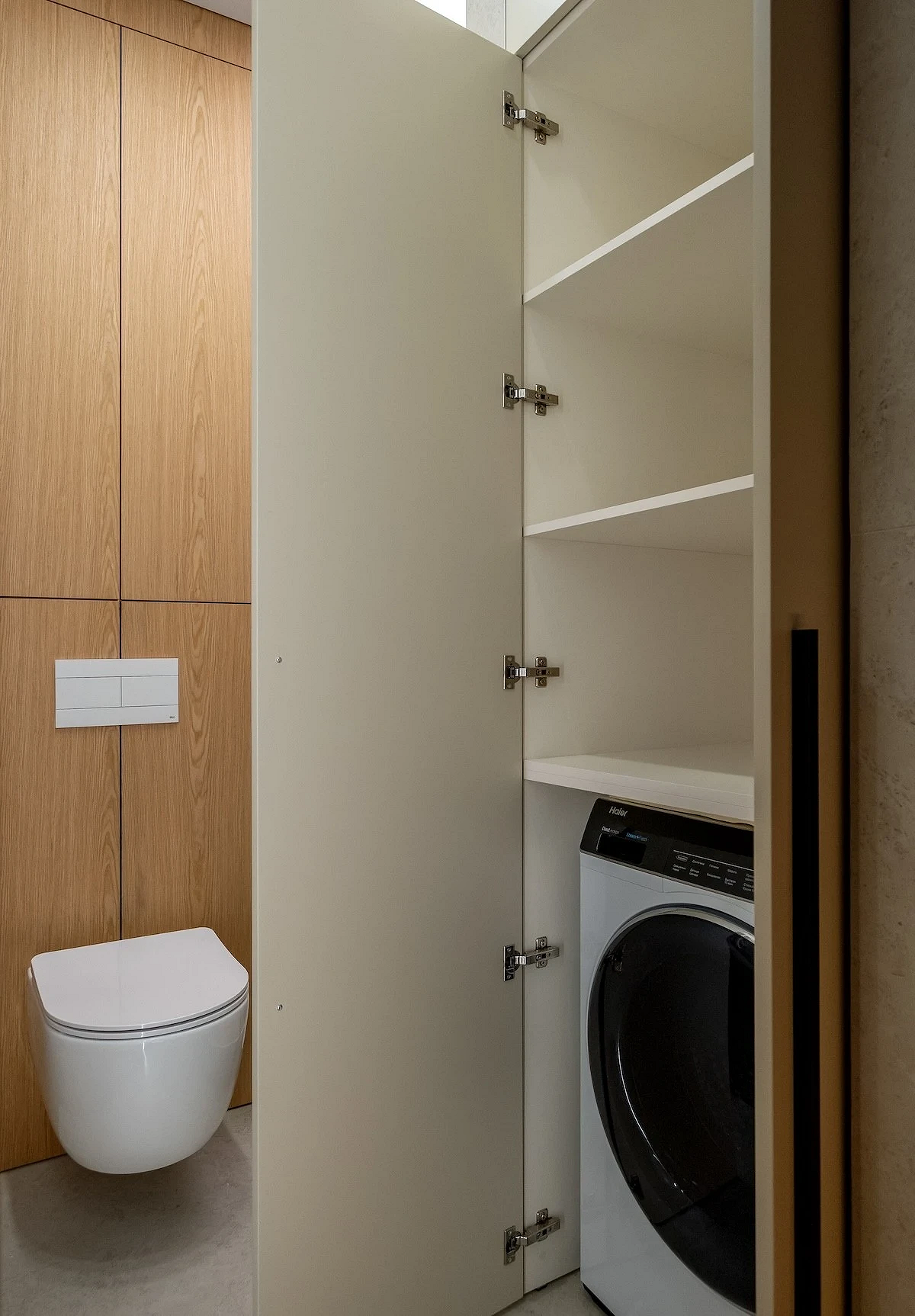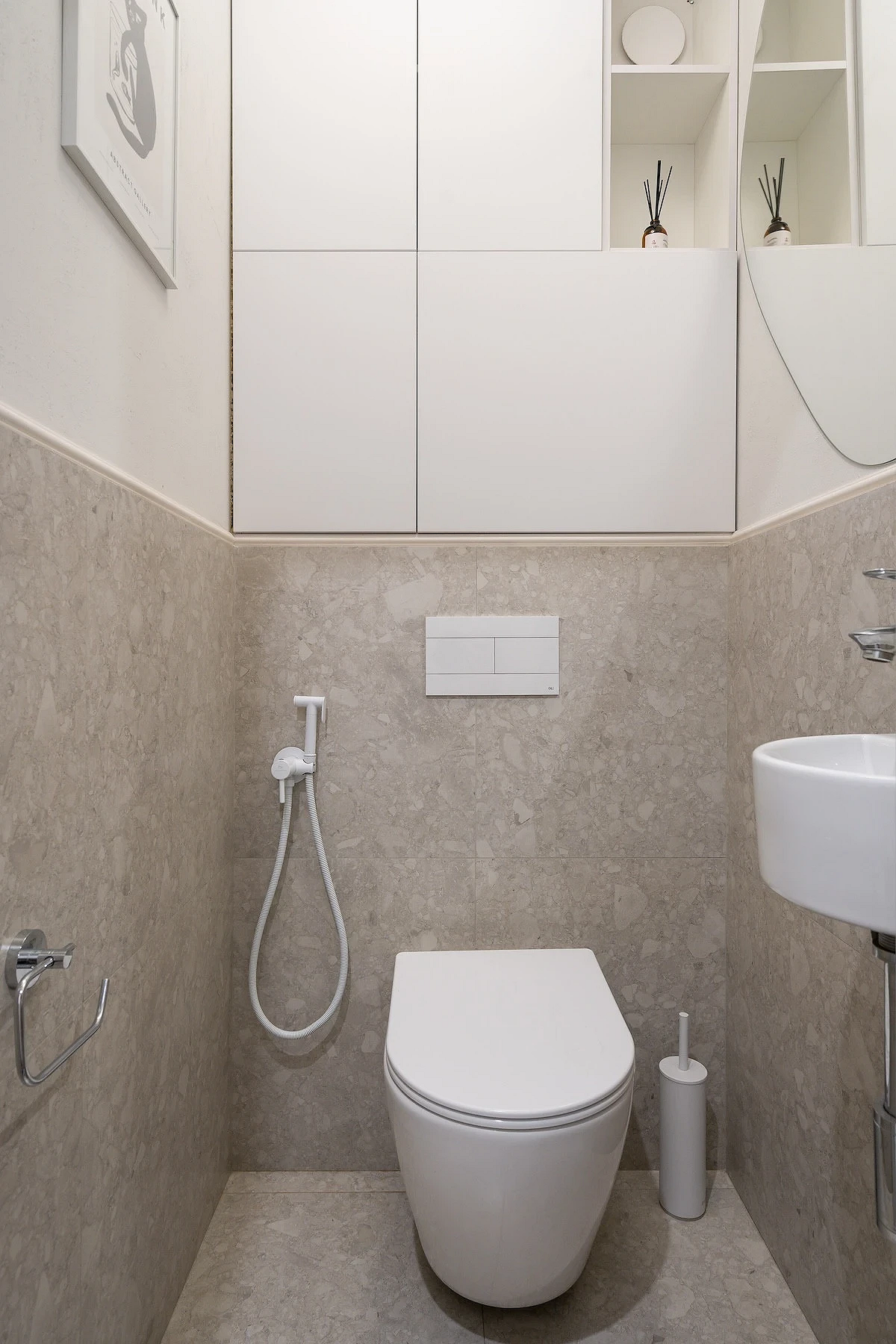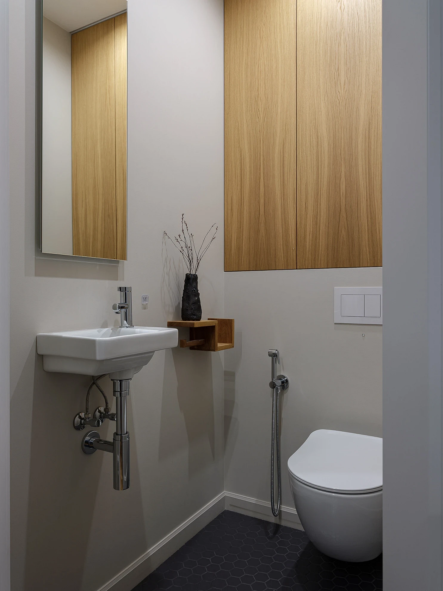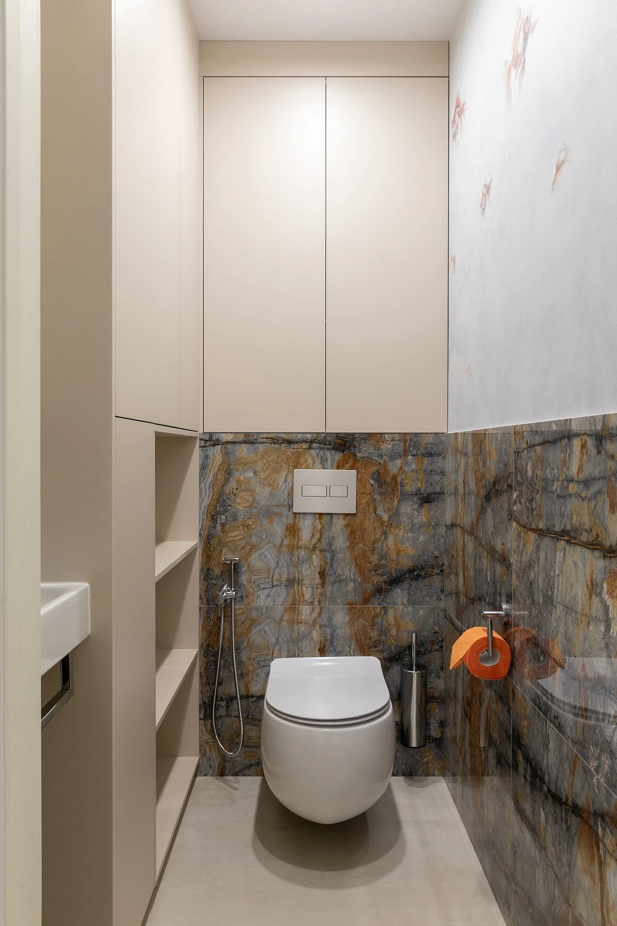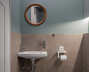 - Если в ванной комнате достаточно систем хранения, для туалета тоже лучше выбрать подвесную раковину. Если же места для всех необходимых вещей категорически не хватает, присмотритесь к компактным неглубоким моделям с тумбочкой. Внутри могут быть ящики или несколько полок — этого хватит, чтобы разместить хозяйственные принадлежности и запасные рулоны туалетной бумаги.