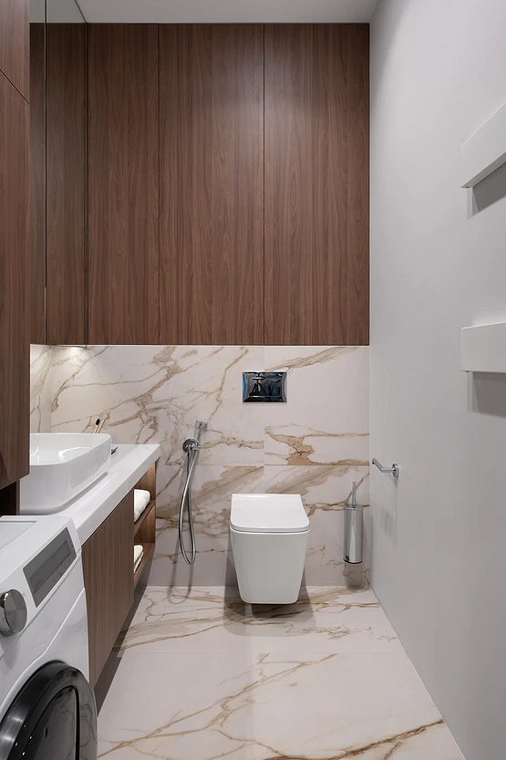 - В отличие от ванной повышенной влажности здесь нет, а значит не обязательно ограничиваться плиткой или влагостойкой краской.
