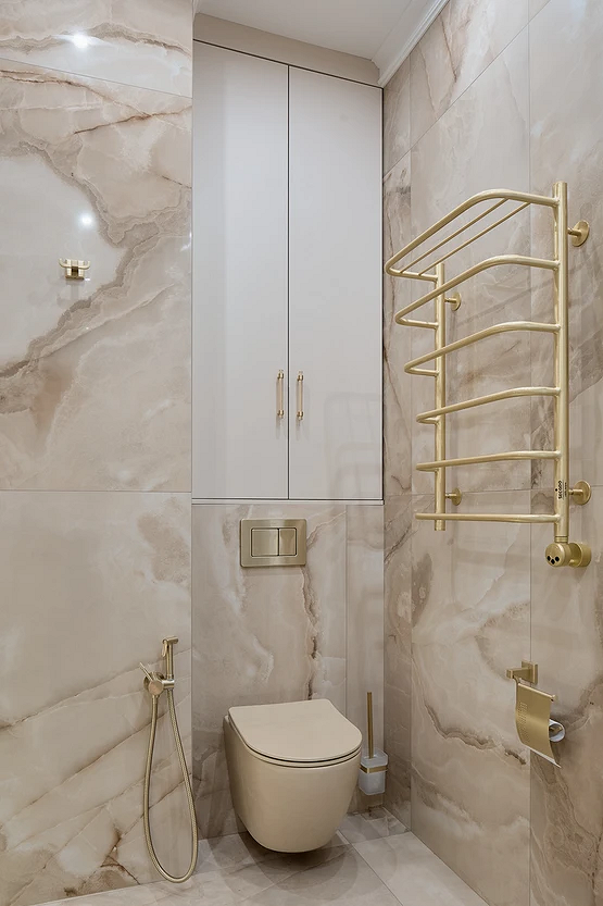 - По возможности используйте подвесной унитаз. Он не только смотрится стильно и современно, но и экономит место, визуально облегчает интерьер за счет пустого пространства между изделием и полом, упрощает уборку.
