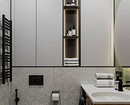 - Узкая ниша напротив, в которой хранятся гигиенические средства. Туда же вмонтировано зеркало — это визуально увеличивает пространство, делает его более светлым.