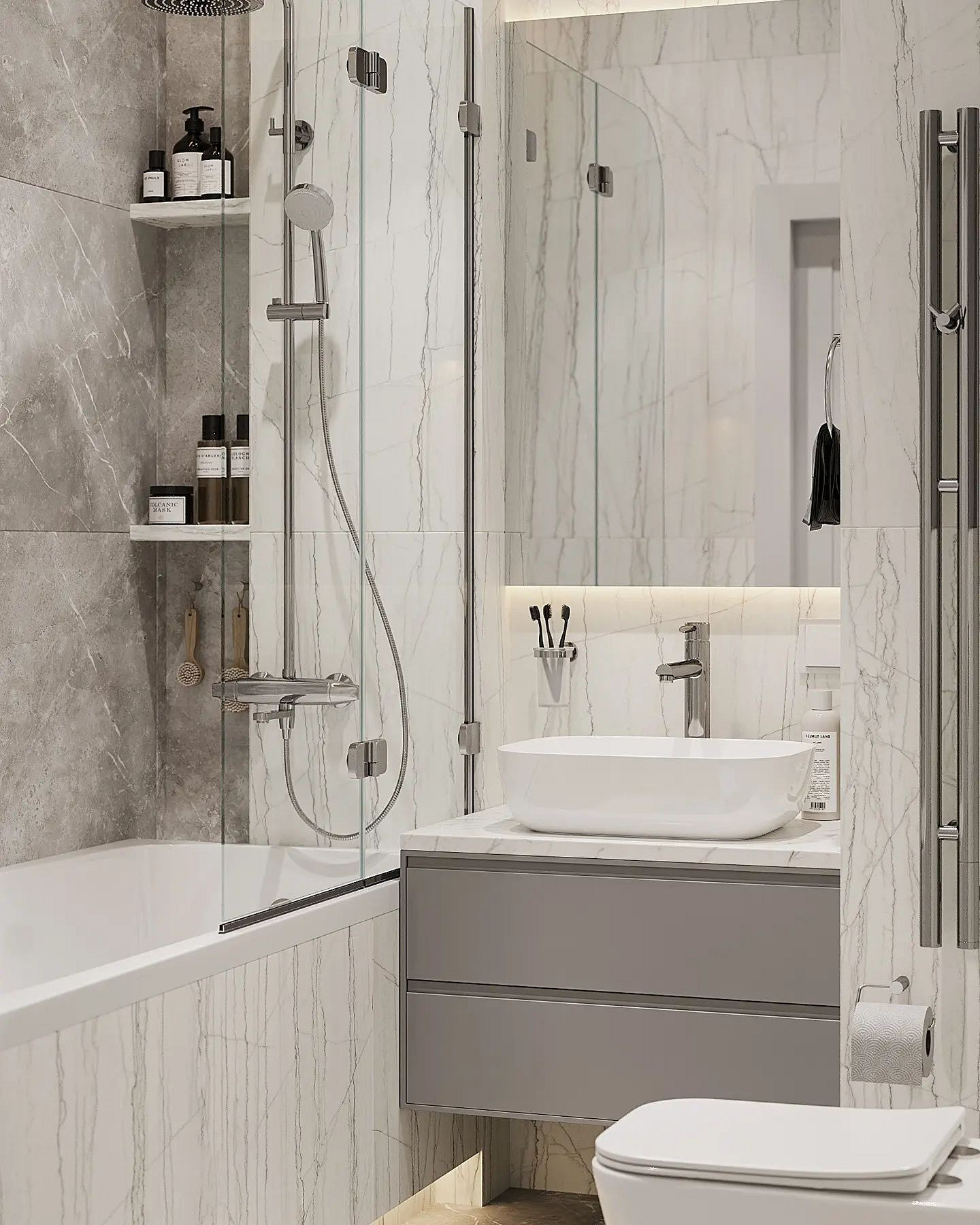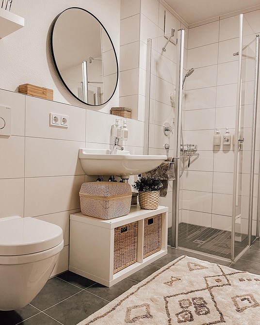 - Чем меньше помещение, тем меньше вещей в нем поместиться. Поэтому подумайте, какие вещи обязательно нужны вам в санузле, а для каких можно найти место в других частях квартиры: например, в спальне, прихожей или кладовке.