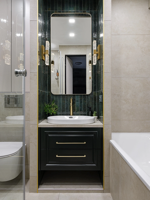 Эту квартиру в сталинке дизайнер оформила для себя и супруга. Общая концепция — комфортный интерьер с историей и ощущением природы. Стены в санузле отделали нейтральным керамогранитом, а нишу под раковину облицевали красивой сине-зеленой плиткой. Глубокий оттенок интересно сочетается с теплой фактурой золота и стеклянными бра по бокам. Получился крупный и смелый акцент в небольшом пространстве.