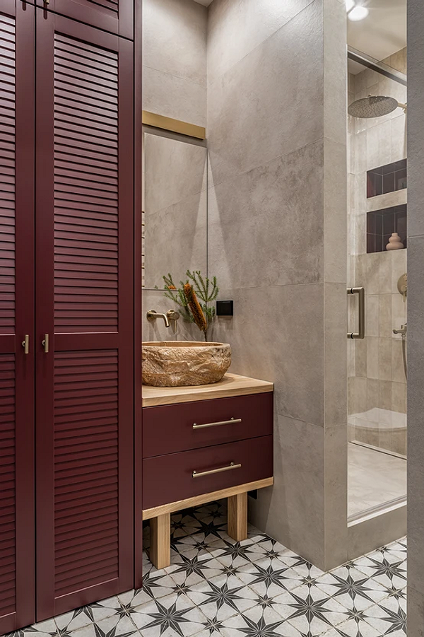 В этом проекте главным героем стала накладная каменная раковина с грубой необработанной поверхностью. Она эффектно контрастирует с гладкими фасадами мебели ягодного цвета и минималистичным смесителем, встроенным в стену. Деревянные элементы тумбы поддерживают оттенок сантехники и перекликаются с матовыми латунными деталями. Завершающих штрих этой зоны — хвойная веточка в вазе, которая продолжает природную тему. Обратите внимание: чтобы не перегружать интерьер и не отвлекать внимание от необычной раковины, подобрали простое прямоугольное зеркало без рамы.