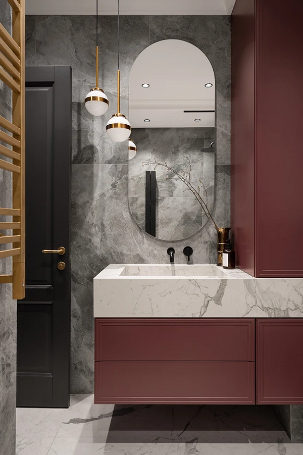 Интерьер этой квартиры воплощает эстетику тихой роскоши. Благородные фактуры дополняет глубокий винный цвет, и это сочетание ярче всего раскрывается в интерьере санузла. В зоне раковины скомбинировали сразу два вида камня: они отличаются и по цвету, и по рисунку, при этом гармонично смотрятся вместе. Создается впечатление, что отделка «перетекает» в столешницу с раковиной — или наоборот. В сочетании с латунными деталями выглядит дорого и в то же время сдержанно.