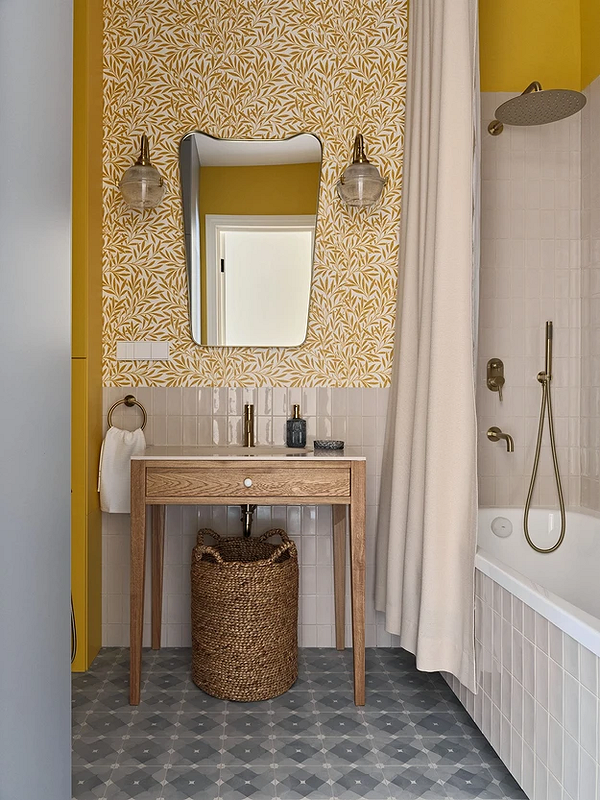 Авторы этого проекта реализовали в оформлении ванной деликатную комбинацию классических и уютных природных элементов. За последнее отвечают обои с растительным узором, деревянная консоль под раковину и плетеная корзина внизу. Приглушенные желтые и песочные тона органично сочетаются с латунной фурнитурой и зеркалом со скругленными краями. Благодаря этому зона раковины смотрится тепло и располагающе.