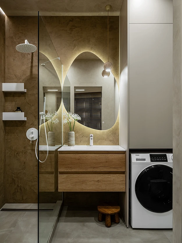 В этой ванной, наоборот, внимание сакцентировали именно на зеркале. Каплевидная форма притягивает взгляд, а подсветка по контуру создает эффект «парения» и мягко подсвечивает фактурную стену. Лаконичная деревянная тумба и стеклянная перегородка подчеркивают минималистичный дизайн и не отвлекают от главной зоны. Такой прием хорош для небольших санузлов, так как зеркало с подсветкой визуально увеличивает объем помещения.