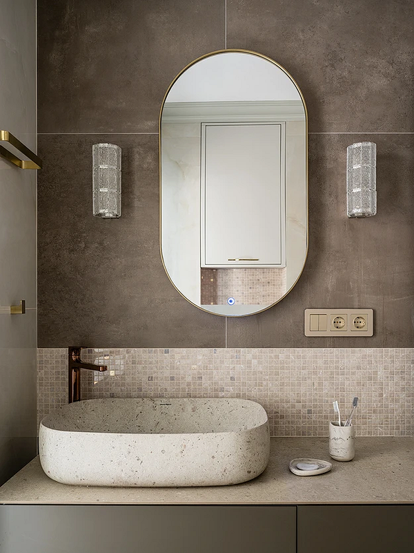 Этот проект — доказательство того, что сдержанная серо-бежевая гамма может выглядеть нескучно. Здесь нет выраженных цветовых акцентов, но взгляд сразу задерживается на раковине благодаря ее расположению. Нехитрый, но такой эффектный прием: сдвинуть ее чуть в сторону, нарушив ось симметрии, которую подчеркивают и парные бра, и швы керамогранита на стене. Дополнительно работают фактуры, которые тоже хочется рассматривать: мелкая мозаика на фартуке, разные рисунки камня на сантехнике, столешнице и даже стакане под зубные щетки.