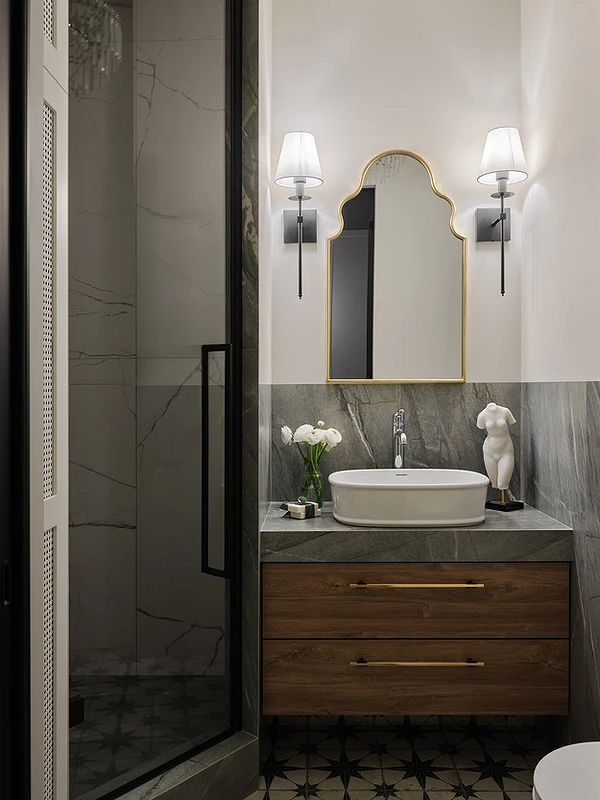 Зону раковины в этом проекте дизайнер оформила по всем канонам классического стиля: строгая симметрия, сдержанные цвета и выверенные пропорции. Все продумано до мелочей, вплоть до сочетания оттенка смесителя с настенными бра. Холодное серебро и хром удивительно мягко контрастируют с латунными деталями. А дополняет классическую эстетику декор на столешнице: букет белых цветов и миниатюрная «античная» скульптура.
