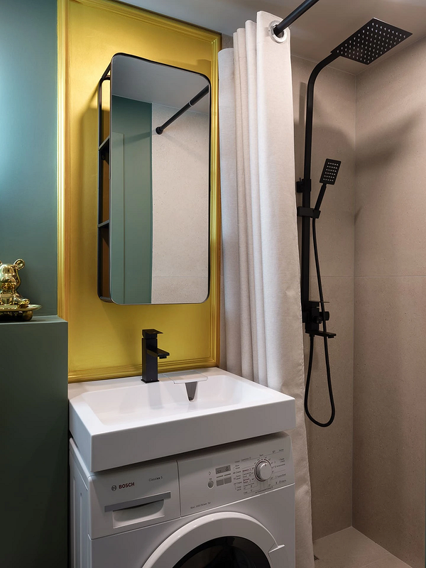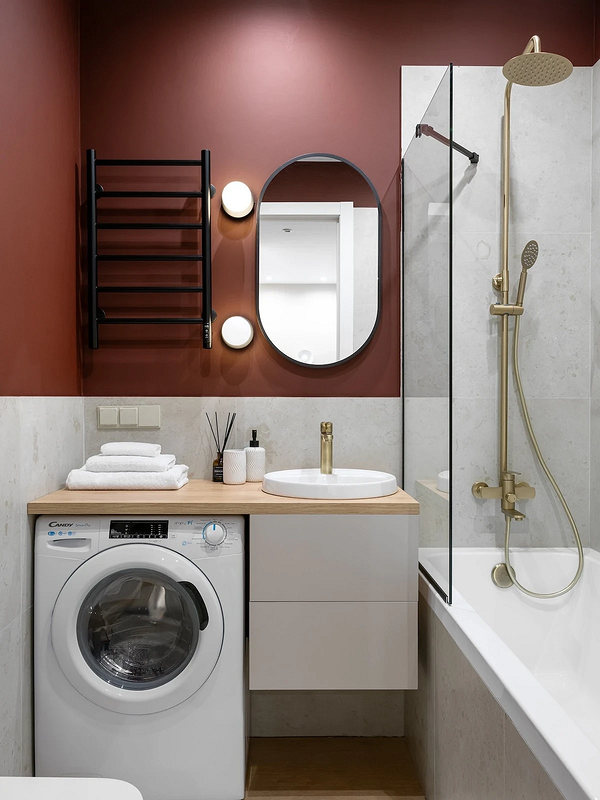 Если стиральная машина находится в санузле, установите ее рядом с раковиной и сделайте для них единую широкую столешницу. Такая поверхность заменяет сразу несколько полок и позволяет разместить органайзеры, полотенца или дозаторы прямо под рукой. Важно, чтобы материал был влагостойким, так как из раковины летят брызги воды. Мелочи храните в корзинах или коробах, чтобы не создавать визуальный шум. По той же причине желательно использовать текстиль в одном цвете.