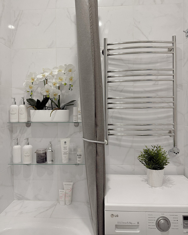 Стеклянные или прозрачные акриловые полки почти незаметны, при этом функциональны. Установите их над унитазом или ванной, чтобы создать зону хранения косметики, аксессуаров или текстиля. Это оптимальный вариант для крошечного санузла, который не хочется перегружать массивными конструкциями. Если вас беспокоит вопрос уборки, поддерживать чистоту таких полок несложно — материалы не боятся контакта с водой, так что просто протирайте их влажной тряпкой.