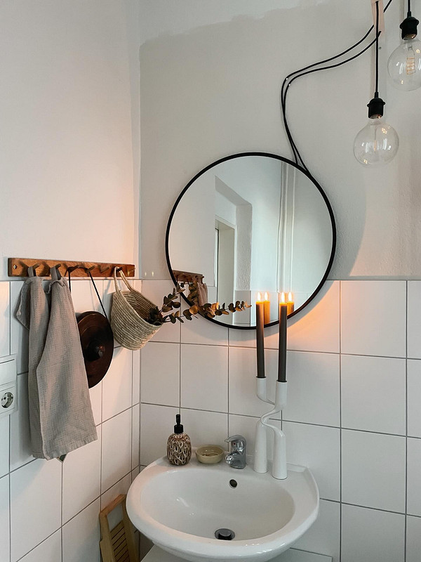 Зеркало может стать полноценной системой хранения, если оснастить его не одной полкой, а несколькими. Это может быть классический шкафчик с зеркальной дверцей или модель с полочками сзади. На них поместятся стакан для щеток, флаконы с косметикой, пара хозяйственных мелочей. Такая конструкция экономит место над раковиной, а еще избавляет от необходимости сверлить стены под дополнительные крепления для полок. Выбирайте зеркало с подсветкой либо организуйте ее вокруг с помощью бра или подвесов.