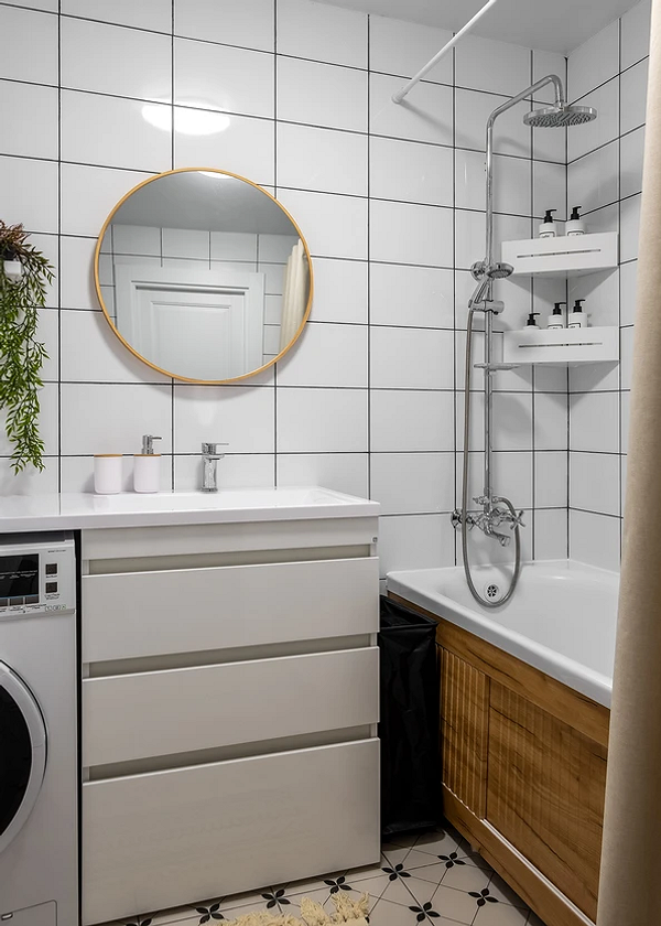 Пространство под чашей ванны часто остается неиспользованным, хотя там помещается немало вещей. Вместо глухого экрана установите раздвижные панели или дверцы. За ними можно сделать несколько полок или просто хранить запасы бытовой химии, тазы или инструменты для уборки, которые не хочется выставлять напоказ. Подберите отделку под дерево или плитку — так экран гармонично впишется в общий дизайн. Используйте пластиковые контейнеры, чтобы организовать вещи по категориям и защитить их от влаги.