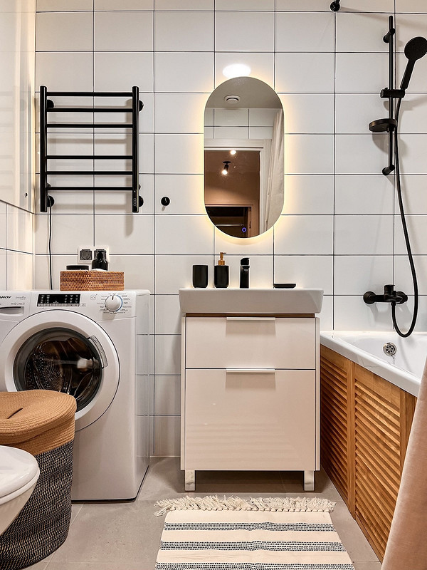 Готовый ремонт от застройщика сегодня частое предложение. Не все могут поменять ремонт сразу, да и въехать в готовую квартиру — гораздо удобнее. Но преобразить типовой ремонт хочется многим. В проекте Елизаветы Краснопёровой был готовый ремонт от застройщика: обычная белая плитка с белой затиркой, ванна с пластиковым экраном, подвесная раковина. Затирку на плитке поменяли с белой на темную — это не только практично, но и выглядит более стильно и графично. Пластиковый экран заменили на жалюзийный деревянный. Также поставили новую тумбу с раковиной.