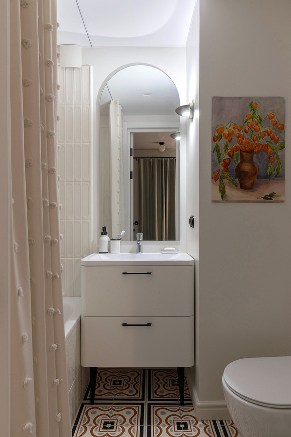 Стеклянная шторка в ванной любима дизайнерами за свою минималистичность. Но она стоит больше обычной шторки, к тому же нужно быть готовым регулярно ее мыть от капель воды, чтобы ванная не выглядела грязно и не ухоженно, тогда как обычную шторку легко постирать даже в машинке, а разнообразие вариантов позволяет выбрать действительно красивую модель. Так, в этом проекте Кристина Московченко выбрала бежевую шторку с «помпончиками», которые выглядят мило и отлично сочетаются с игривой настенной плиткой.