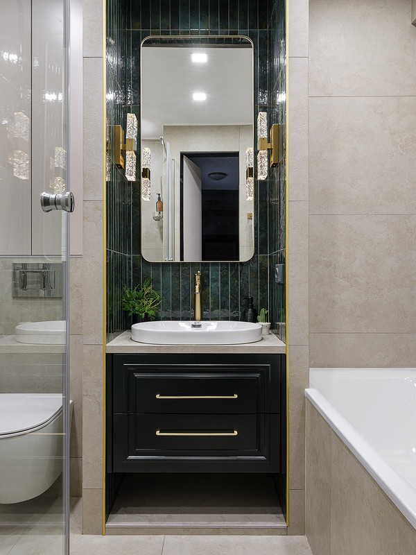 Известный дизайнерский прием — комбинация разной отделки. В ванной комнате сочетают разные виды плитки и керамогранита, плитку и краску, плитку и обои. Это помогает не только сделать акцент, но и оптимизировать бюджет: например, для одной стены выбрать яркую цветную плитку из дорогой коллекции, а фоново уложить недорогую. Это то решение, которое использует Светлана Тепфер в своей квартире. В ванной раковина оформлена в нишу из стен, и этот участок выделен изумрудной мелкоформатной плиткой, тогда как остальные стены — в сером керамограните под камень.