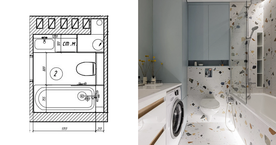Для типовых домов характерны раздельные санузлы, и не всегда хозяева хотят или могут их объединить. Этот проект демонстрирует как раз такую планировку. Площадь ванной — всего 2,6 квадрата со стенами 1,7 и 1,5 метра соответственно. Вдоль широкой, напротив входа, установили полноразмерную ванну. По бокам от двери в санузел расположили раковину с хранением и стиральную машину. Над последней также повесили полотенцесушитель. Дверь открывается наружу, что дополнительно экономит место.