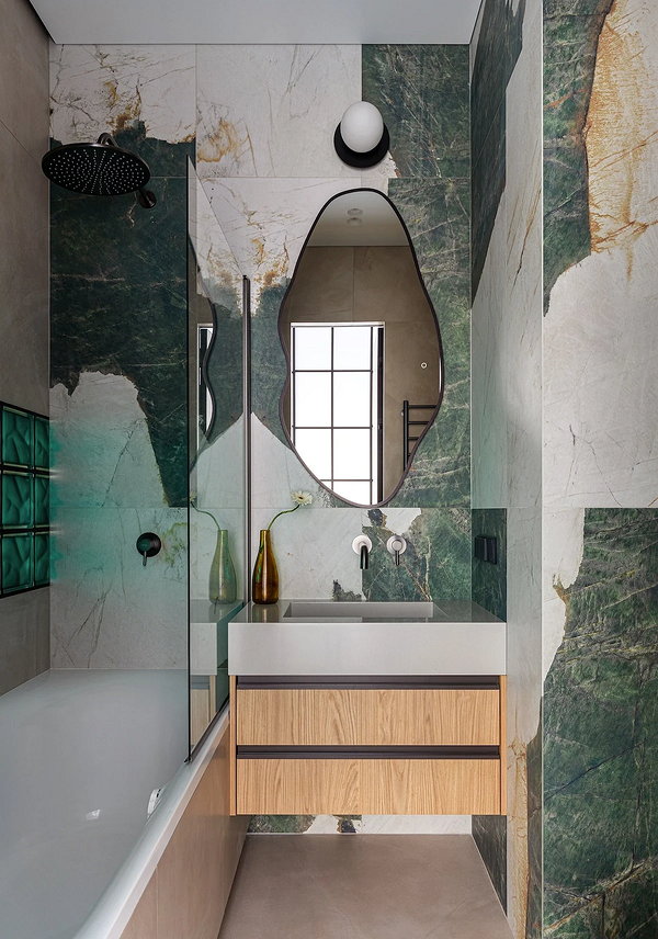 Классическое правило сочетания отделки в санузле постепенно уходит на второй план. Больше не нужно держаться в рамках одного базового и одного акцентного материала — можно сочетать сразу несколько активных. В том числе мелкую цветную плитку и крупноформатный керамогранит под мрамор с контрастным рисунком. Если выбрать для ванной спокойные природные оттенки, такая комбинация отлично смотрится. В примере на фото плитку использовали для оформления зоны вокруг раковины, а керамогранитом облицевали остальную часть ванной.