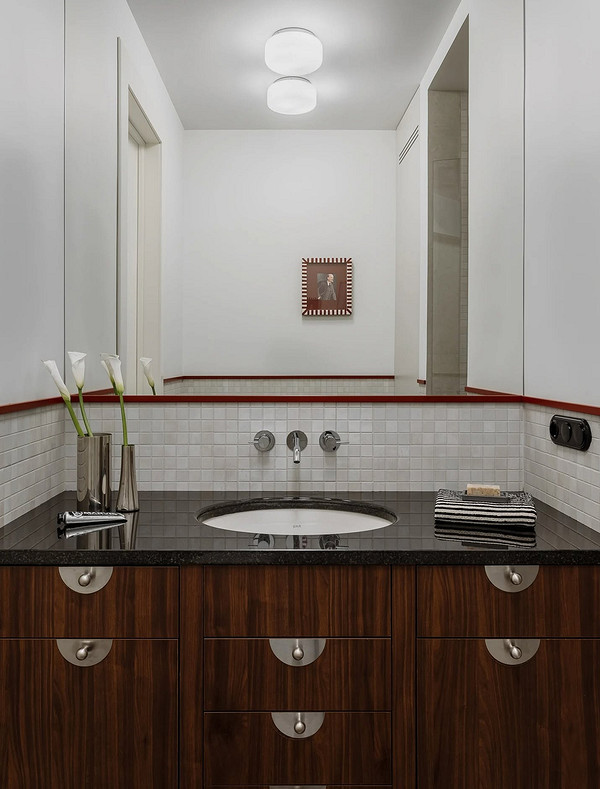 Долгое время в приоритете было светлое дерево в скандинавской эстетике — «безопасный» вариант для небольших помещений и монохромного минимализма. Сейчас же возвращается мода на натуральную ярко выраженную фактуру. Дизайнеры все чаще выбирают мебель и отделку в насыщенных коричневых оттенках и с контрастным древесным рисунком. Например, как эта тумба под раковину. Несмотря на то, что в палитре ванной есть винный оттенок, темно-коричневые фасады смотрятся не менее ярко и выступают естественным крупным акцентом.