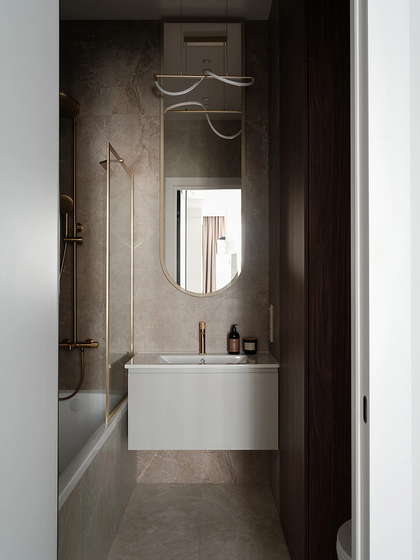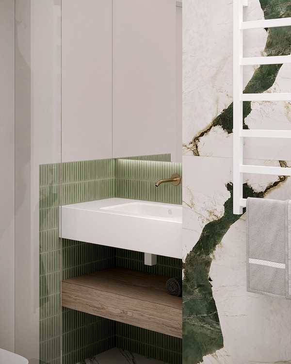 Считается, что керамогранит под мрамор или другой камень должен максимально достоверно имитировать натуральный материал. А это значит, что рисунок должен быть непрерывным и бесшовным. Но что если отойти от стандарта? Именно так сделали в этом проекте. Санузел облицевали базовым бежевым и акцентным керамогранитом под цветной камень. При этом он представляет собой не цельное полотно, а собран из фрагментов, которые не совпадают друг с другом точно по рисунку. Это дает вау-эффект и делает отделку еще выразительнее.