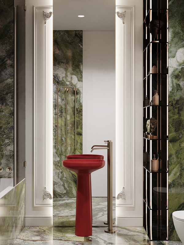 Раковина — отличный кандидат на роль акцента в ванной комнате. Можно выбрать нестандартную форму, яркий цвет или фактуру. Или не ограничиваться чем-то одним — как в этом интерьере. Если отделка санузла сама по себе активная, можно подобрать раковину, которая будет привлекать внимание сразу по нескольким причинам. Так, здесь это напольная модель с выразительным силуэтом и яркого, нетипичного для сантехники цвета. Такая раковина становится главной фокус-точкой интерьера.