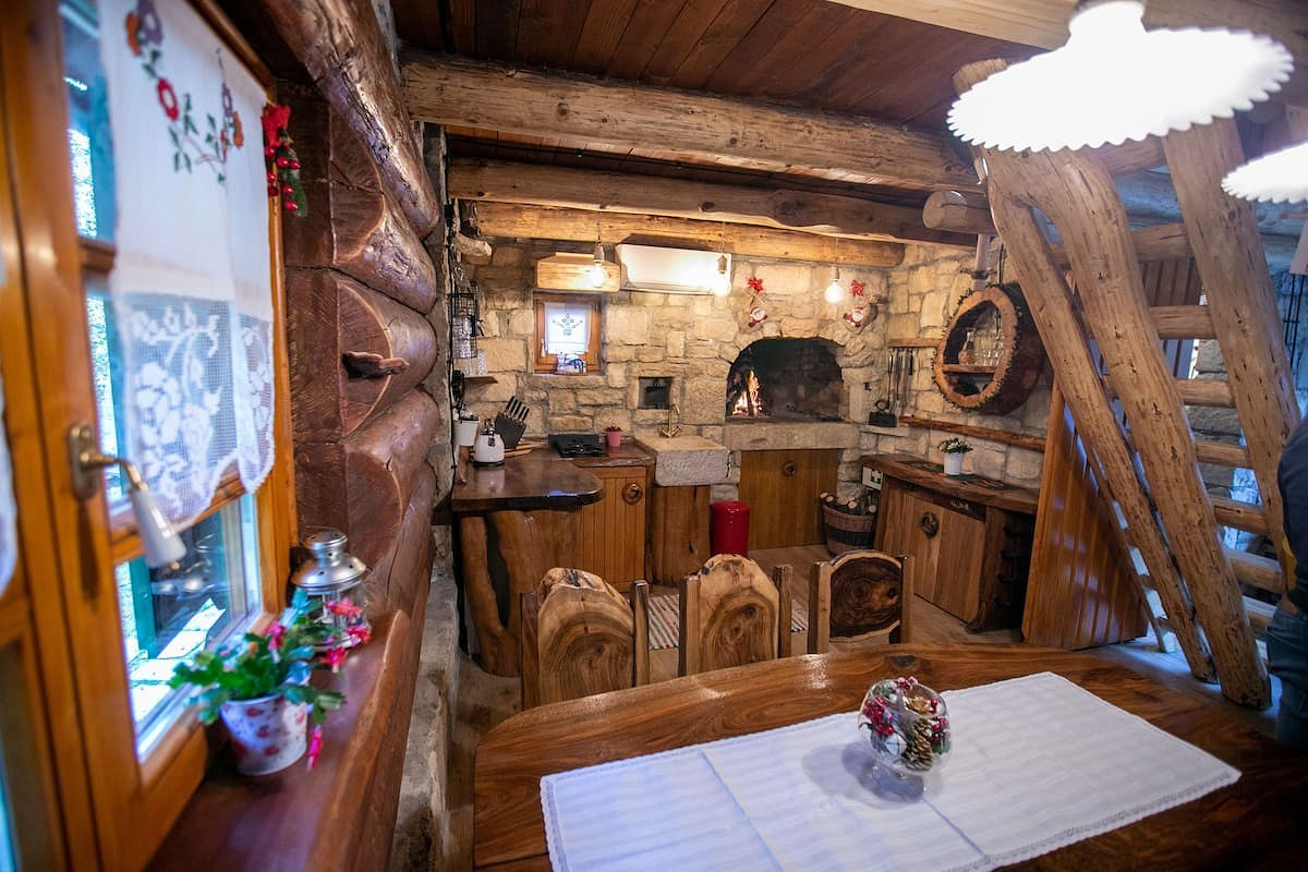 В Хорватии можно арендовать старый мельничный дом, который отреставрировали, сохранив его изначальную атмосферу. Крупные деревянные балки, винтажная мебель, цветастый уютный текстиль — идеальная основа, чтобы создать рождественский интерьер, как в кино. Грубая каменная отделка усиливает ощущение единения с природой, при этом пространство не выглядит слишком «пряничным». Очень много необычного экодекора, например, журнальные столики из пней и спилов бревен.