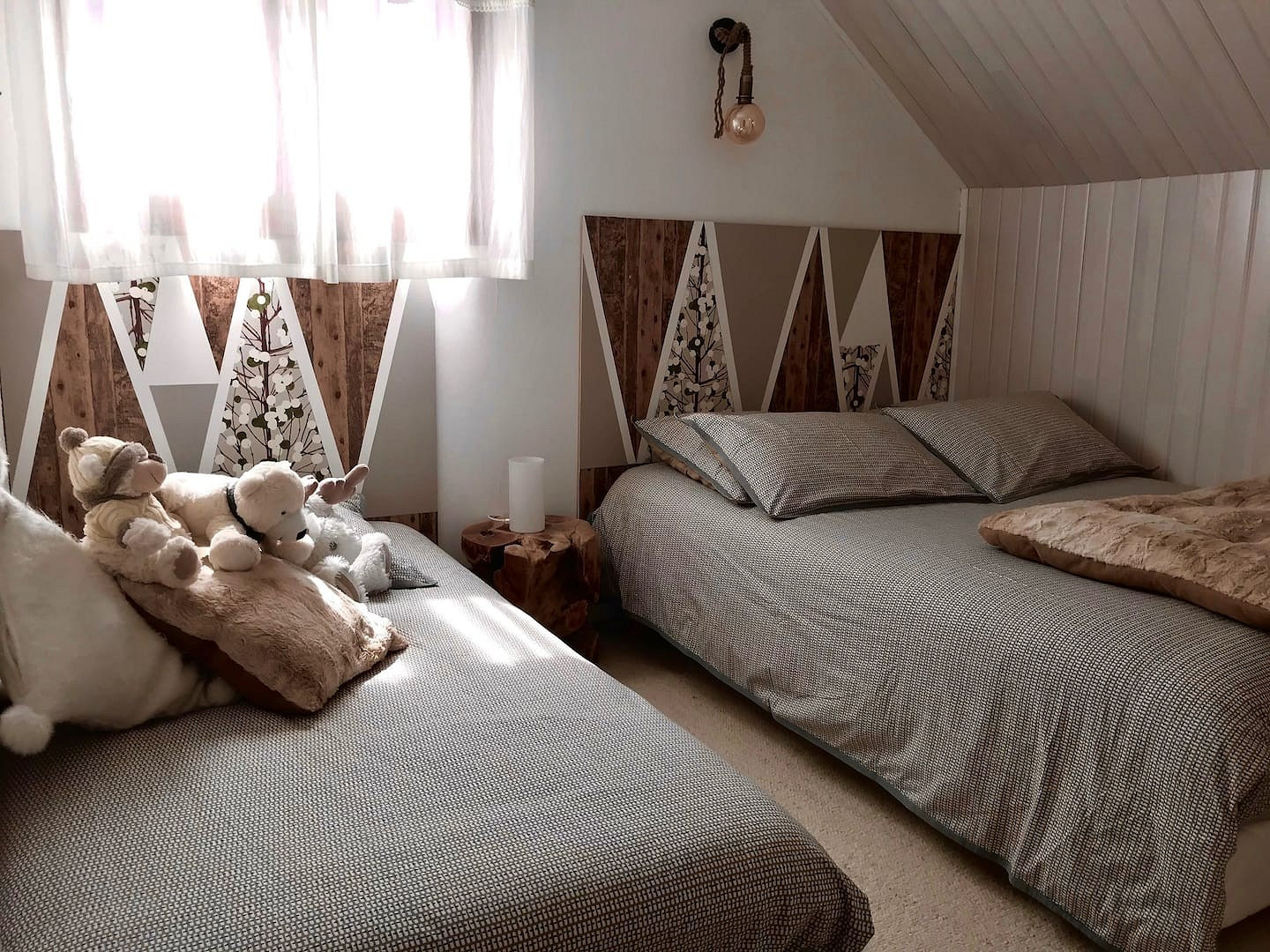 Шале оформлено в светлой цветовой гамме, преобладает деревянная отделка. Очень много атмосферных деталей: печка с поленьями, меховой ковер и покрывала, журнальный столик из старого пня, объемные балки под потолком. Кухня достаточно маленькая, но оборудована местом для приготовления раклета — традиционного французского блюда из плавленого сыра. Из окон открывается потрясающий вид на горы и покрытое льдом озеро. Настоящая рождественская сказка.