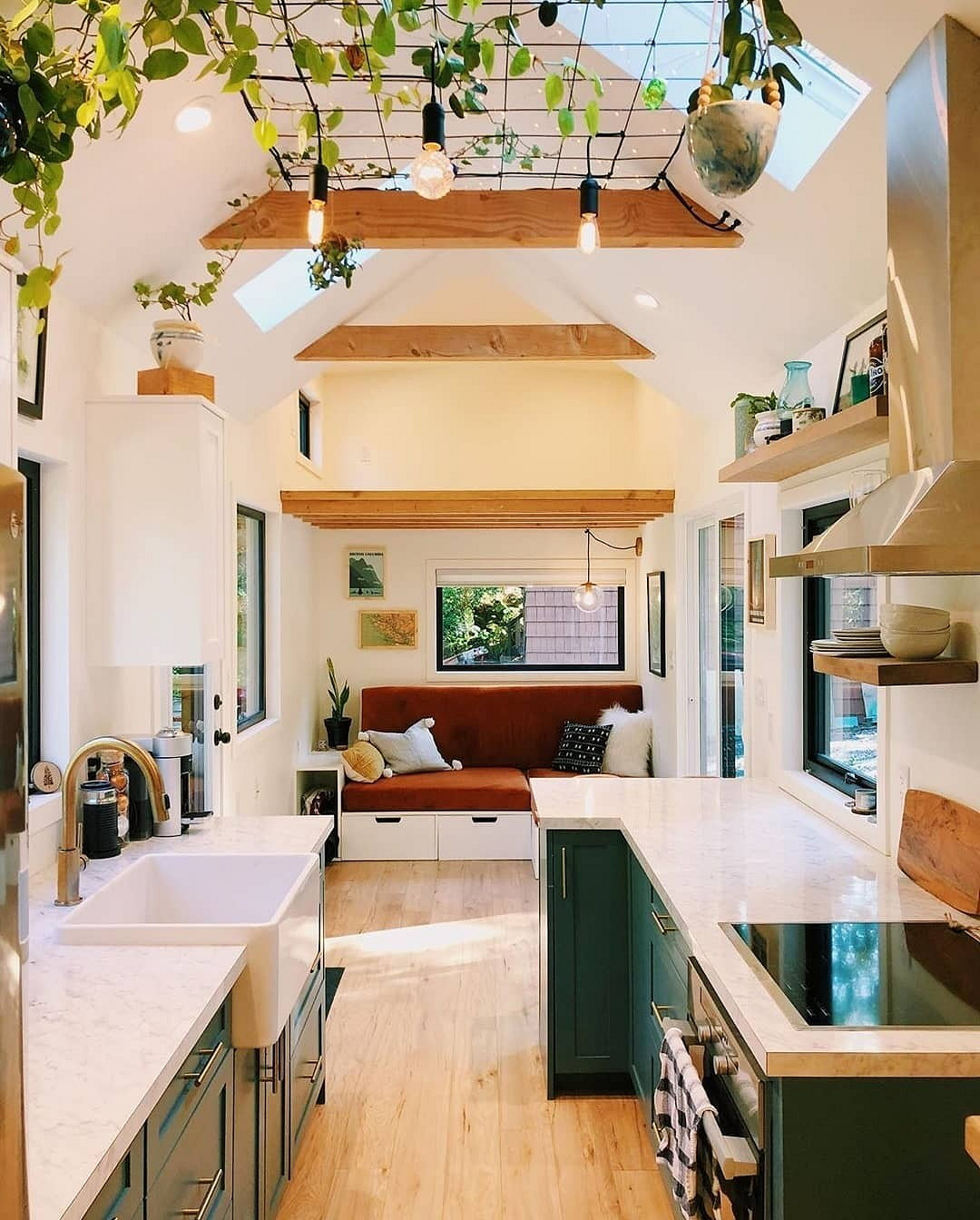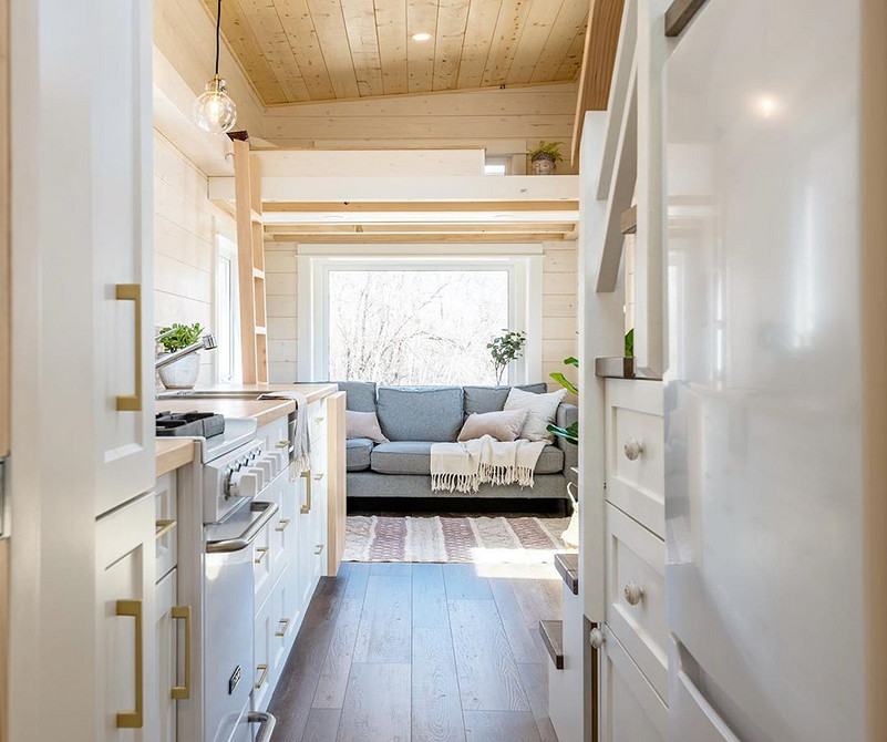 На крохотной площади сложно разделять зоны так, как обычно делают в больших домах или в квартирах: по комнатам или с четкими границами в виде перегородок, стеллажей и ширм. Но, в целом, разные функциональные зоны могут собираться вместе, как конструктор, без использования приемов зонирования, и при этом оставаться удобными и красивыми.