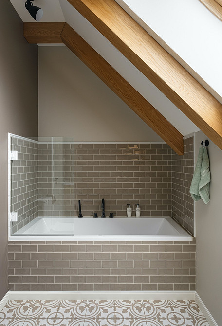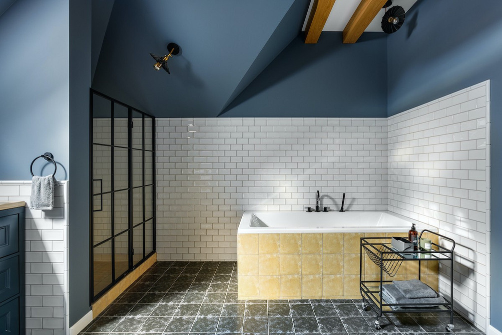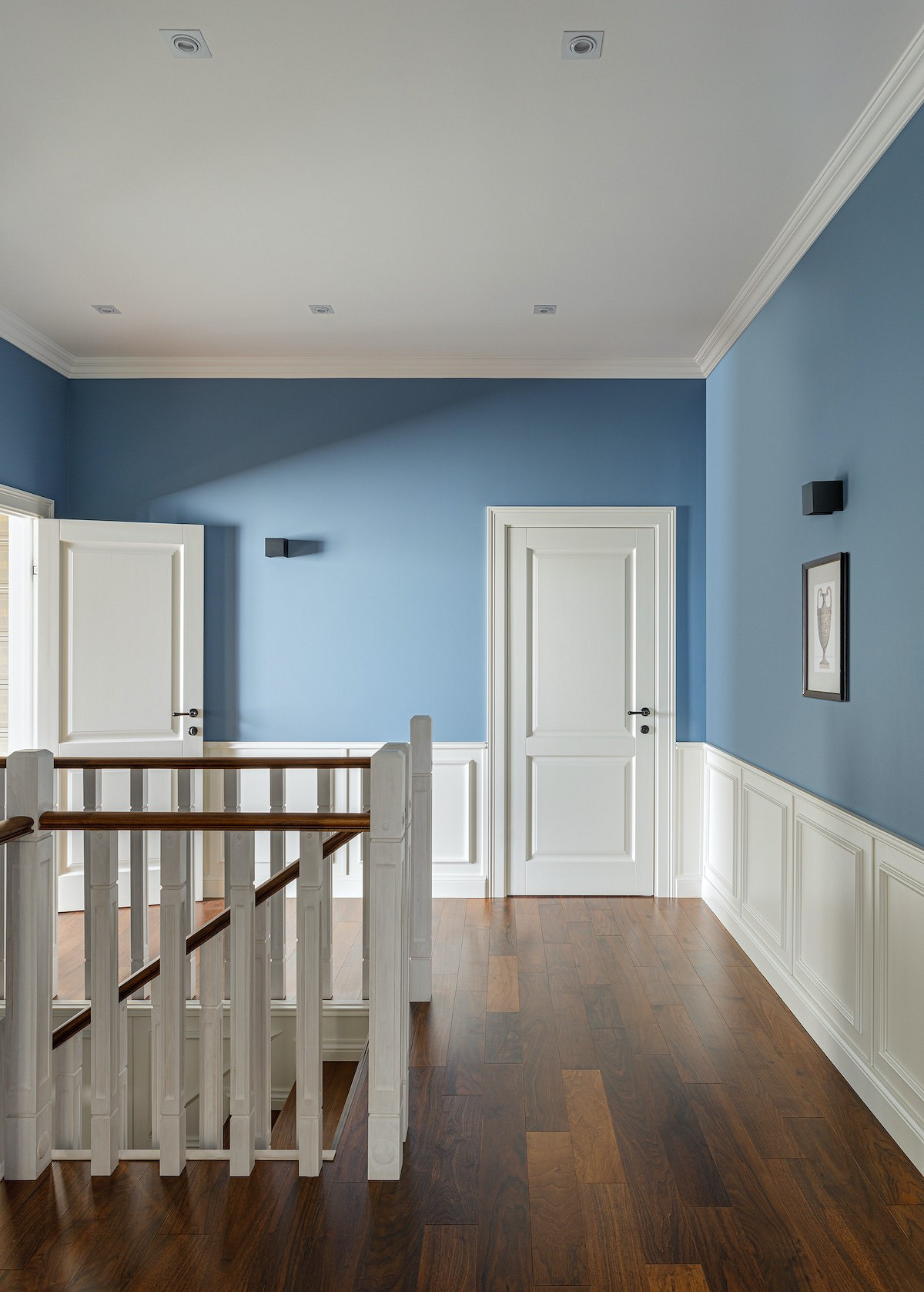 Отделка служит не только выгодным фоном для мебели и декора, но и акцентом — синие стены общей зоны контрастируют с теплым деревом на полу, декоративные молдинги на стенах в холле сочетаются с метлахской плиткой, краска на стенах в санузлах выгодно скомбинирована с простым «кабанчиком» и напольным узорчатым керамогранитом в мастер-ванной и санузлах.