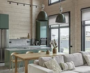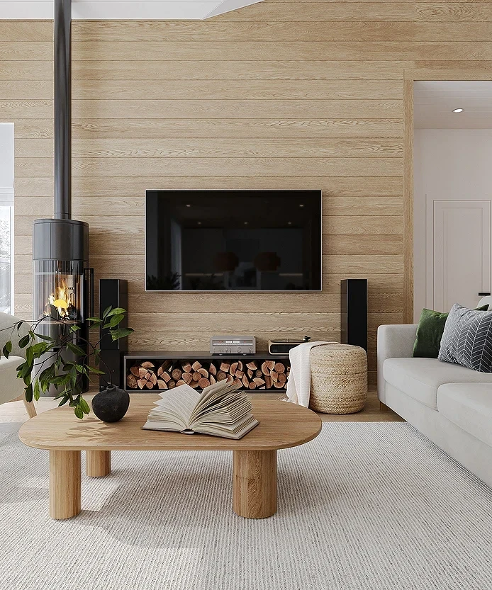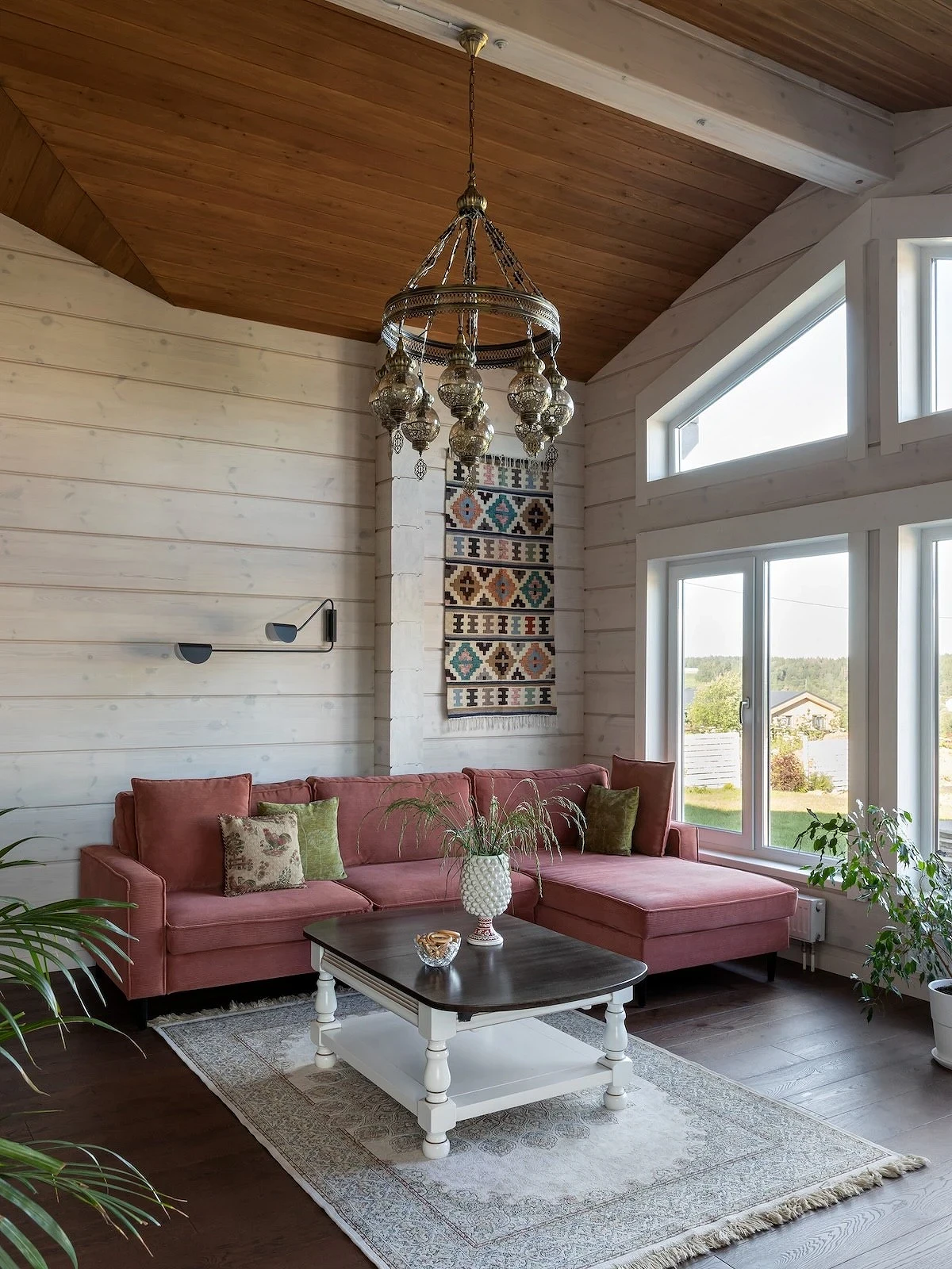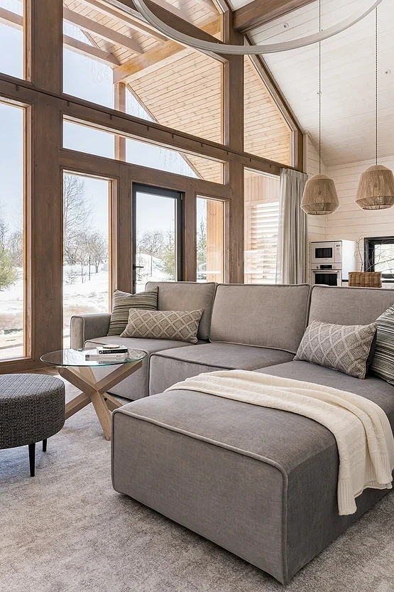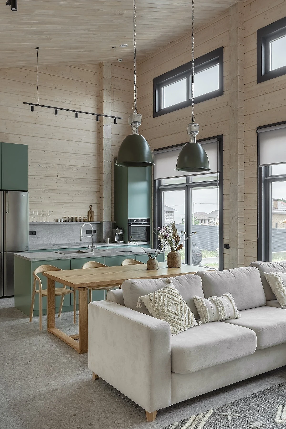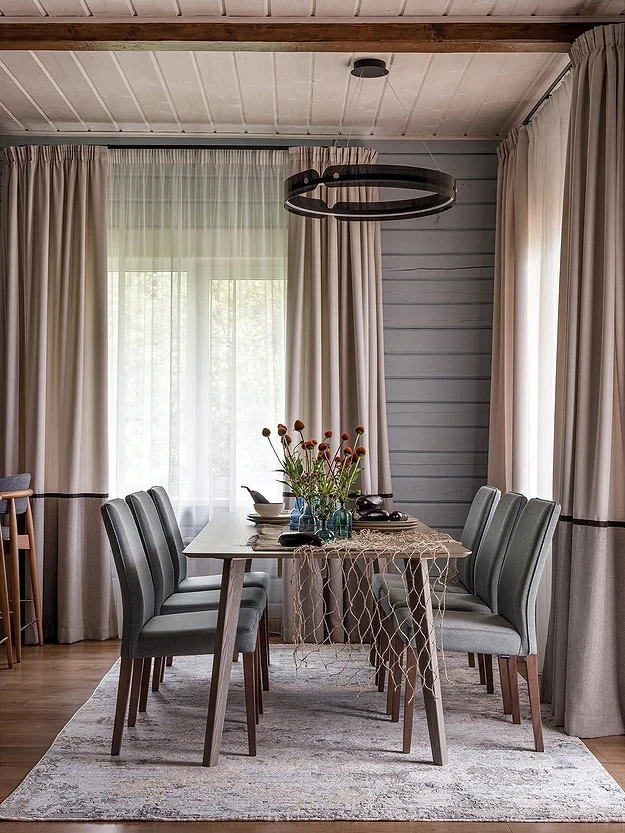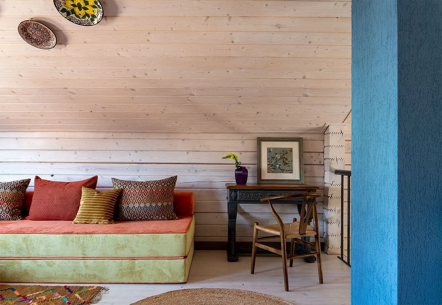 А подчеркнуть их красоту и фактуру поможет мебель и текстиль в насыщенных природных оттенках — оливковом, бордо, баклажановом и т.д. Ярких и сочных чистых цветов следует избегать, так как они будут перебивать неброскую красоту древесины.