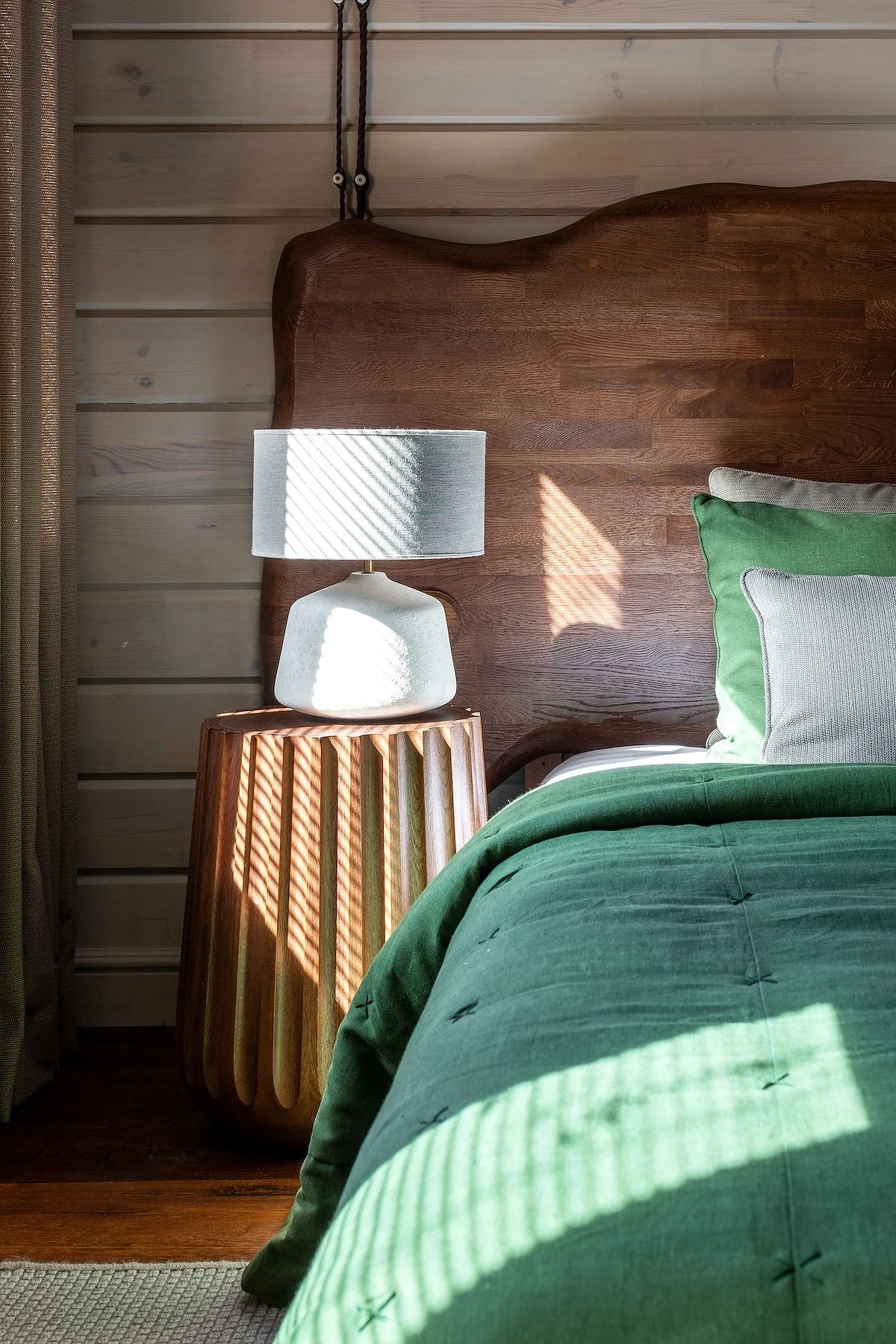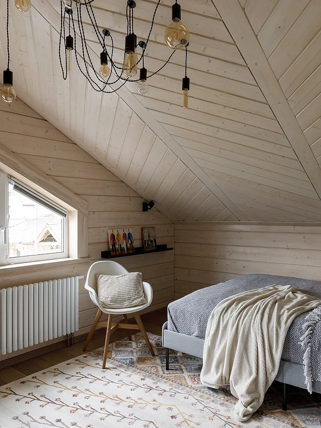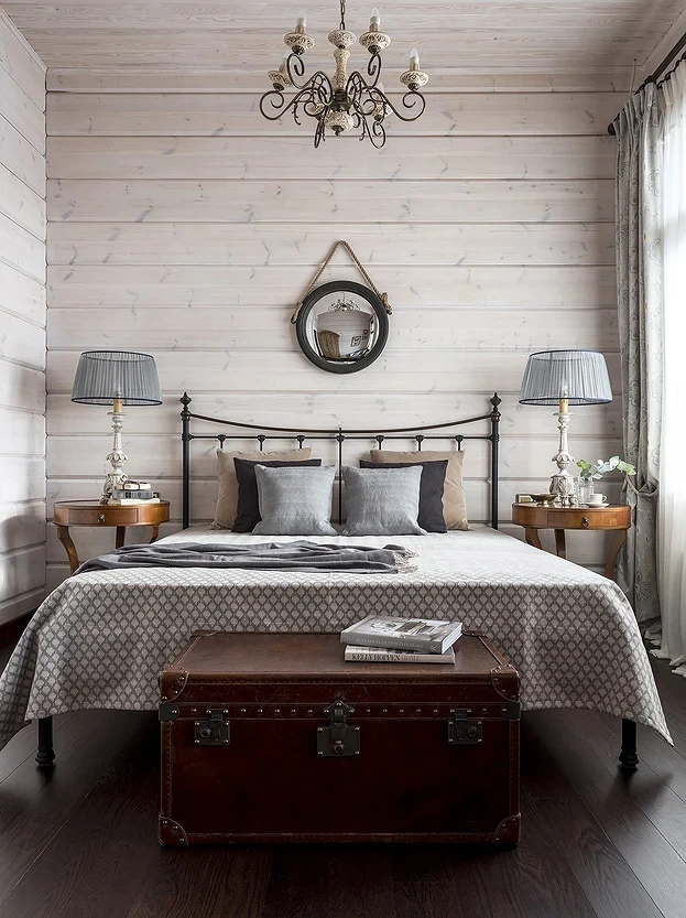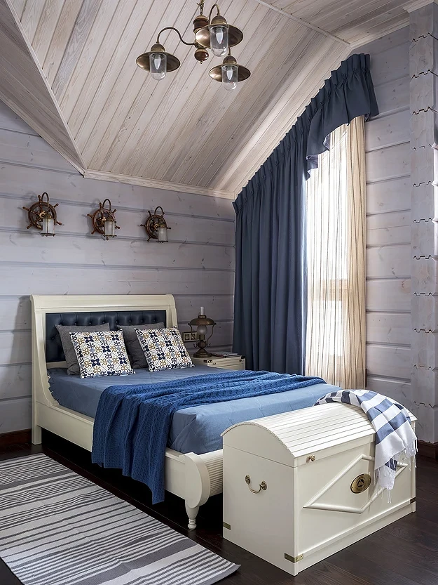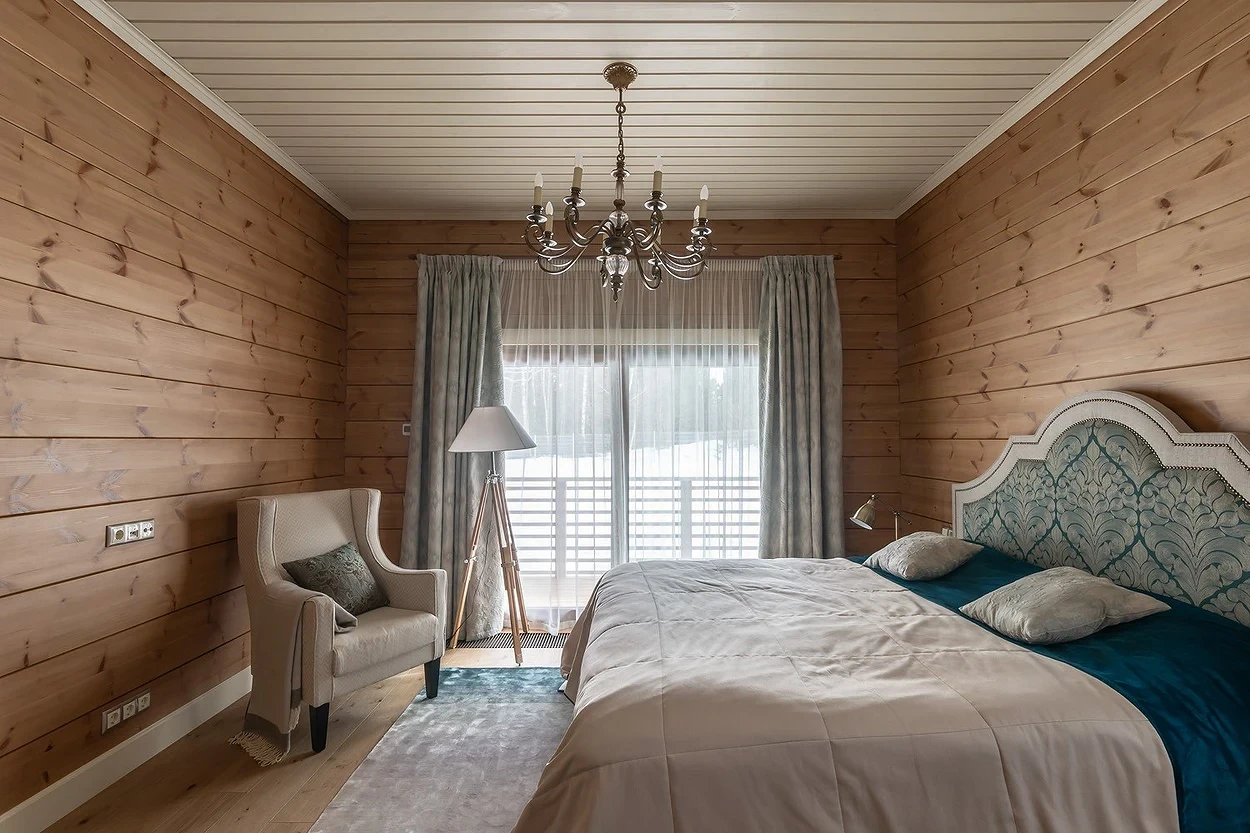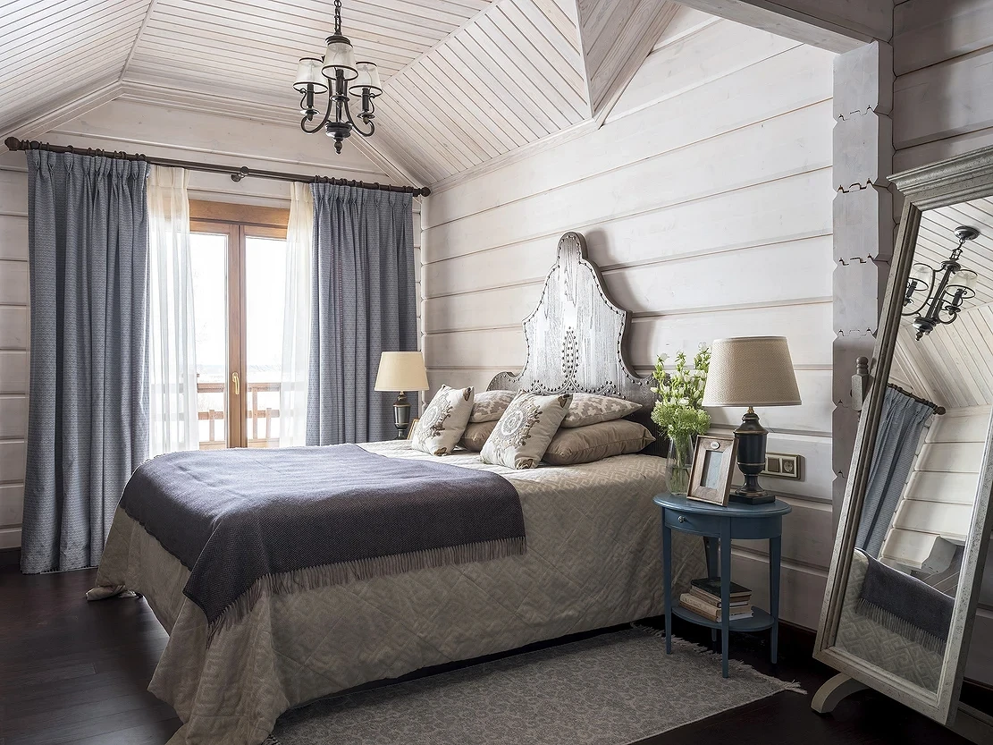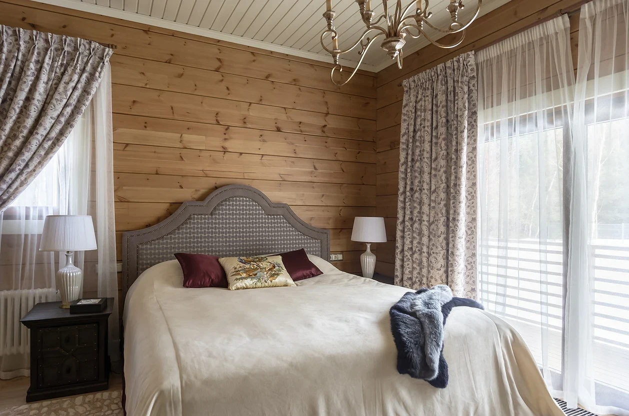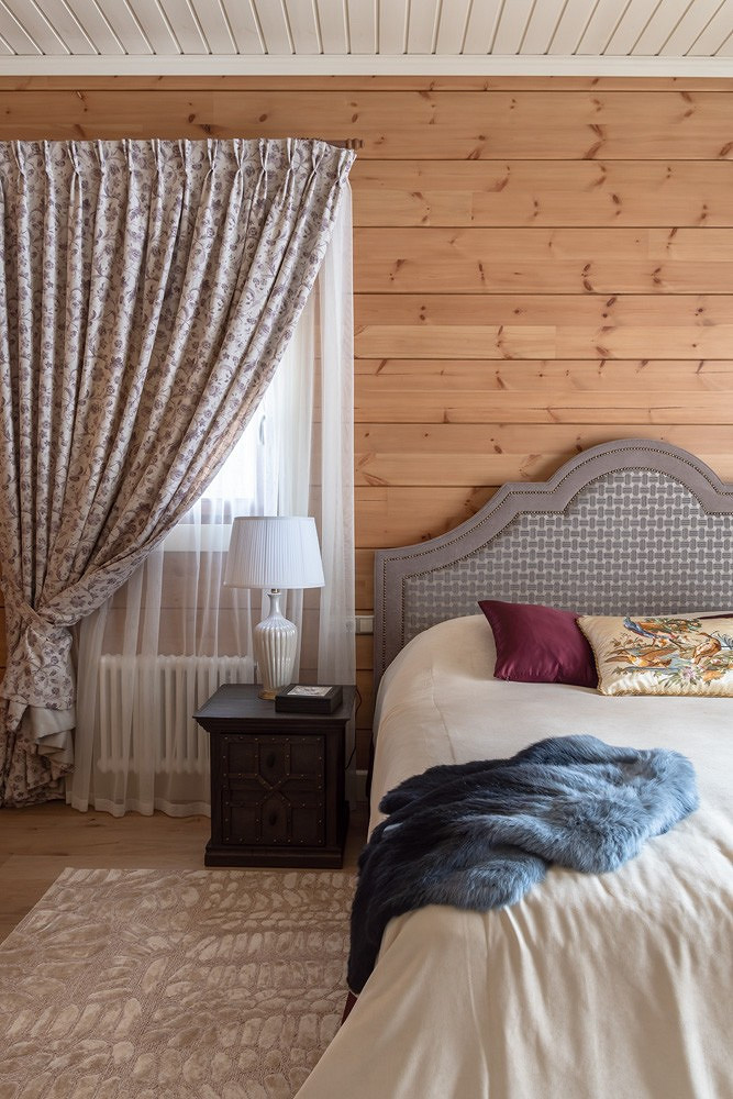 Мягкое изголовье, пушистый ковер и шторы из плотной ткани, укладывающейся красивыми волнами, скрасят некоторую простоту древесины и подарят комнате уют. Еще более расслабляющей и спокойной сделает атмосферу неяркий свет из нескольких источников: потолочную люстру стоит дополнить бра, настольными лампами или торшером. А вот от декора лучше отказаться или использовать его по минимуму — он будет отвлекать и прогонять сон.