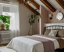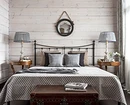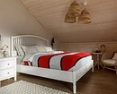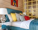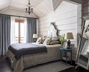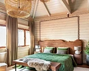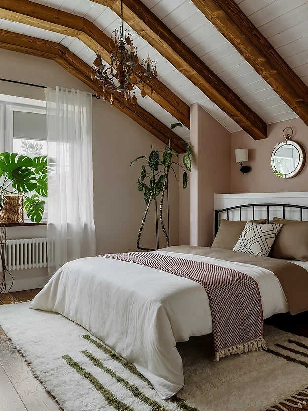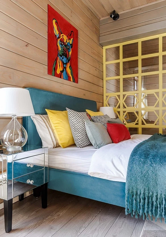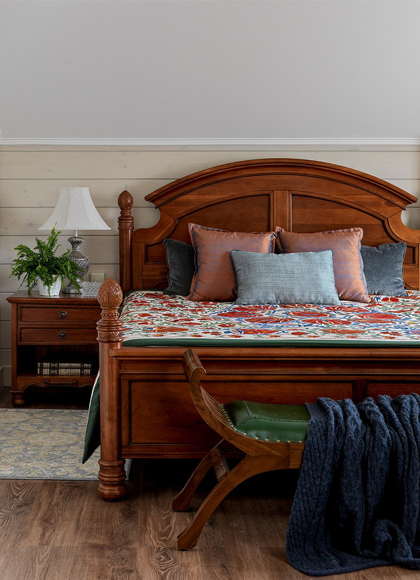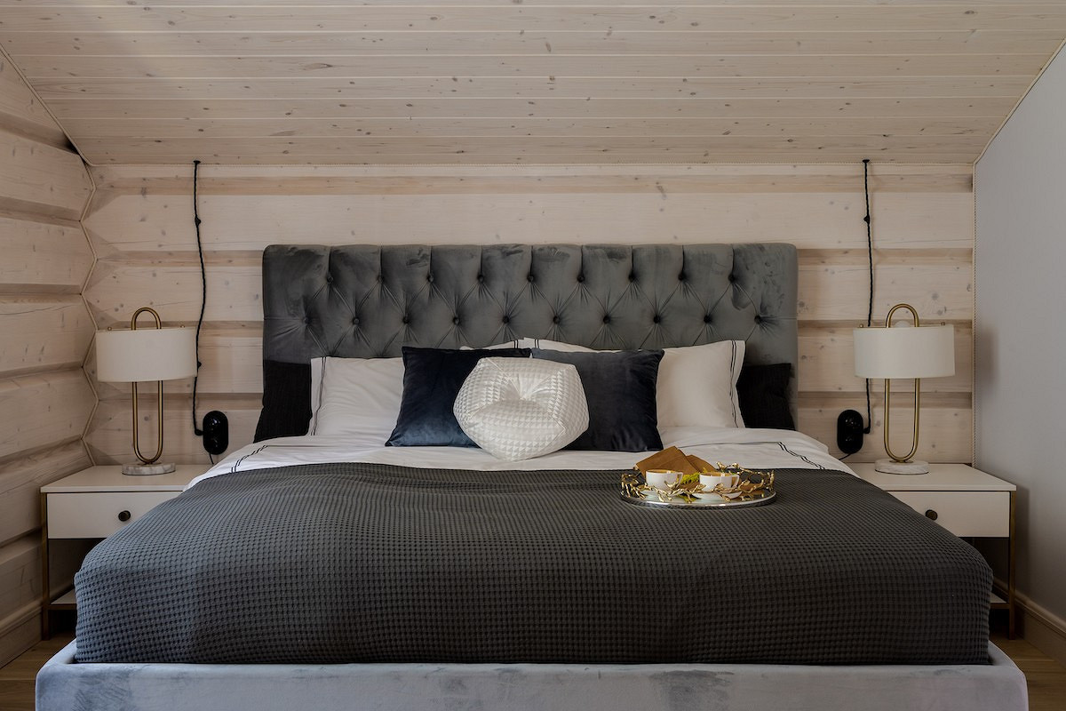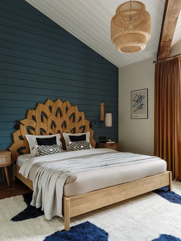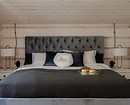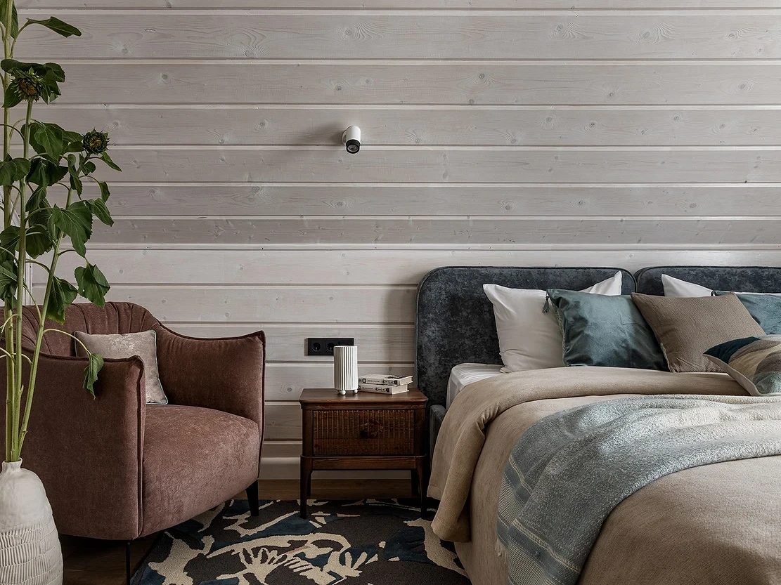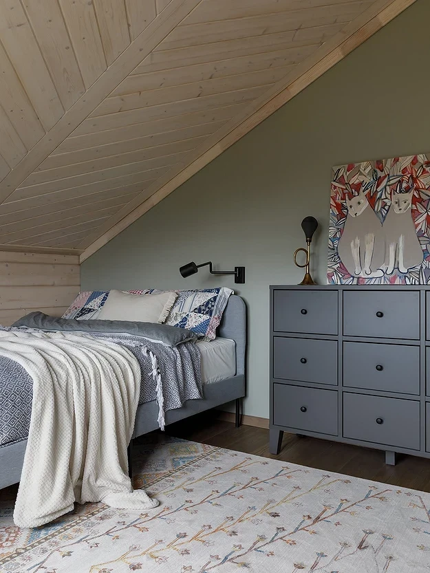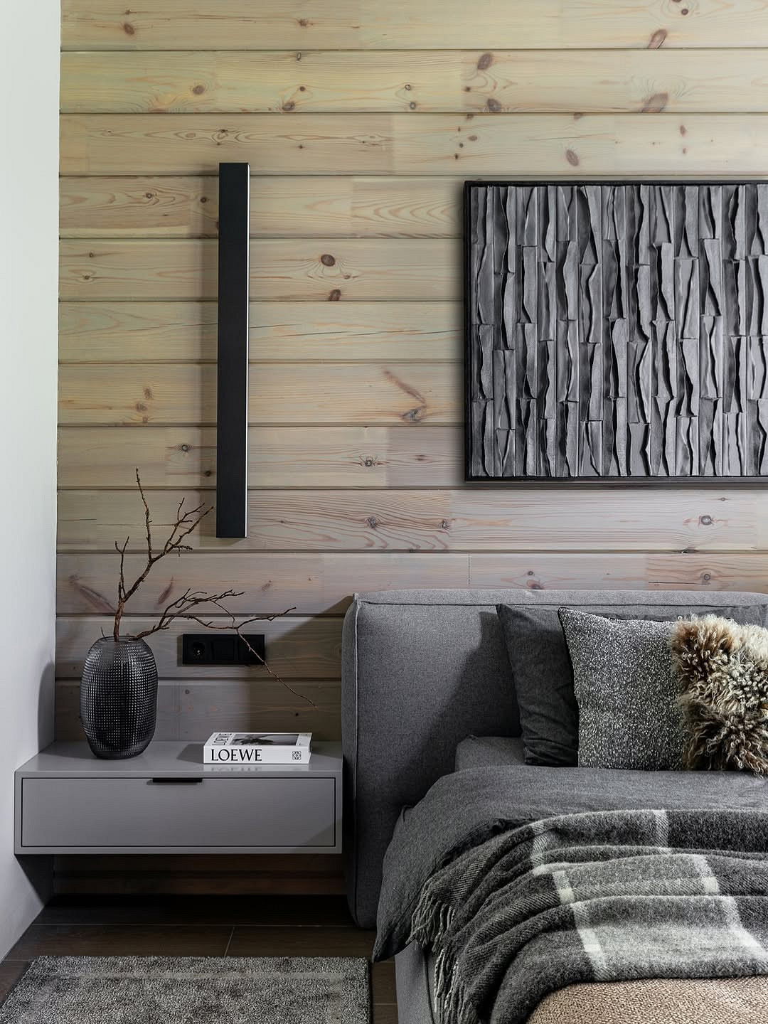Мягкое изголовье, пушистый ковер и шторы из плотной ткани, укладывающейся красивыми волнами, скрасят некоторую простоту древесины и подарят комнате уют. Еще более расслабляющей и спокойной сделает атмосферу неяркий свет из нескольких источников: потолочную люстру стоит дополнить бра, настольными лампами или торшером. А вот от декора лучше отказаться или использовать его по минимуму — он будет отвлекать и прогонять сон.