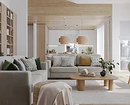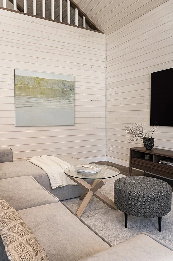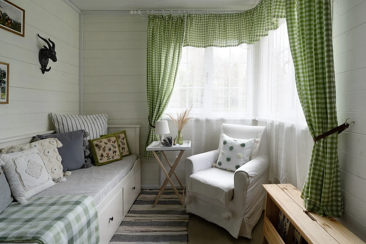 Это обилие света и воздуха, категоричное «нет» загромождению и обилию вещей и четкое «да» — уютной лаконичности. Деревянные стены и потолок оставляют в естественном виде (защитив лаком или пропиткой) либо красят в светлые оттенки. Окна предпочтительны без штор либо на них вешают легкие короткие занавески из натуральных тканей, ковры и мебель выбирают в пастельных неброских оттенках и максимально простой формы без навязчивых украшательств.