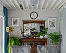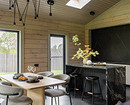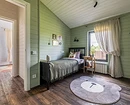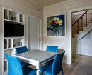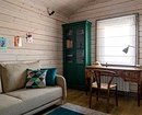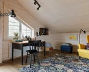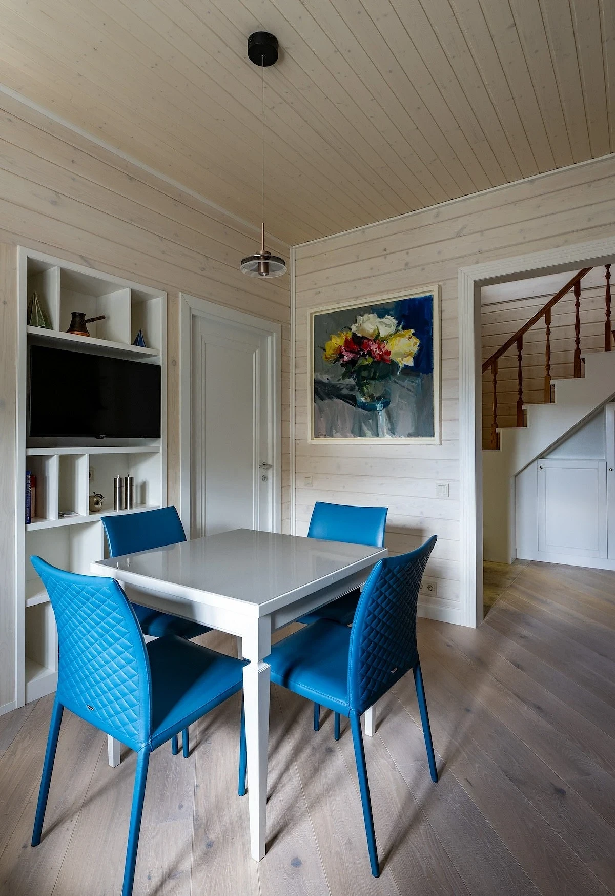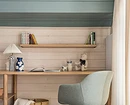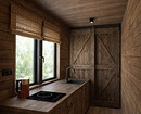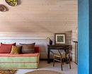 Здесь можно оставить отделку как в первоначальном виде (если дом сделан из светлого бруса), так и покрасить стены и потолок, при этом будут более уместны пастельные тона: молочные, голубые, бежевые.